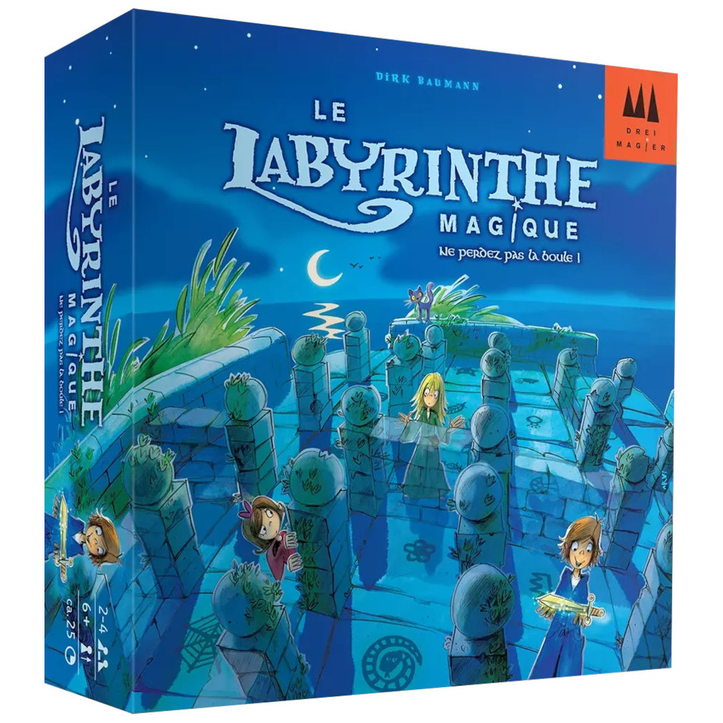 Ne perdez pas la boule !Les joueurs doivent collecter 5 objets dans le labyrinthe magique. Placez les murs du labyrinthe puis essayez de mémoriser le parcours qui est ensuite recouvert par le plateau de jeu !Chaque joueur choisi un magicien et se place à un angle du plateau, il glisse une bille métallique, sous le plateau, qui va se fixer à son pion. Le joueur lance le dé et déplace son magicien. S’il arrive sur la case où se trouve le jeton objet il gagne cet objet et on place un nouveau jeton.Mais si un magicien se cogne contre un mur la bille tombe et il doit alors repartir à sa case de départ. Ambiance garantie !!!