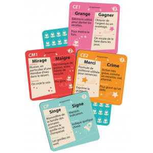 Les mots sont rigolos !Un jeu amusant pour enrichir son vocabulaire, du CP au CM1. Quatre extra-terrestres débarquent pour étudier notre langue.Au programme : 200 mots avec pour chacun sa définition, son anagramme (par exemple « rame » et « mare ») et sa devinette ! Donnez les bonnes réponses et gagnez un maximum de cartes mots.- Inclus : un manuel pédagogique gratuit à télécharger !- Pour enrichir son vocabulaire du CP au CM1 en s’amusant !- De jolies illustrations.