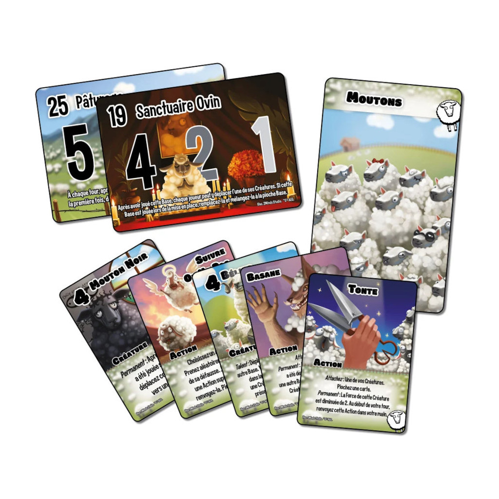 20 cartes Faction Moutons, 2 cartes Base Moutons, 1 séparateur de Faction, 1 règle de jeu