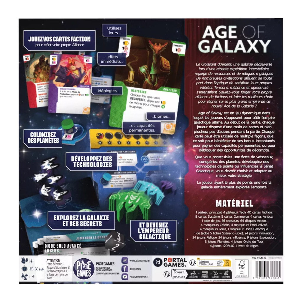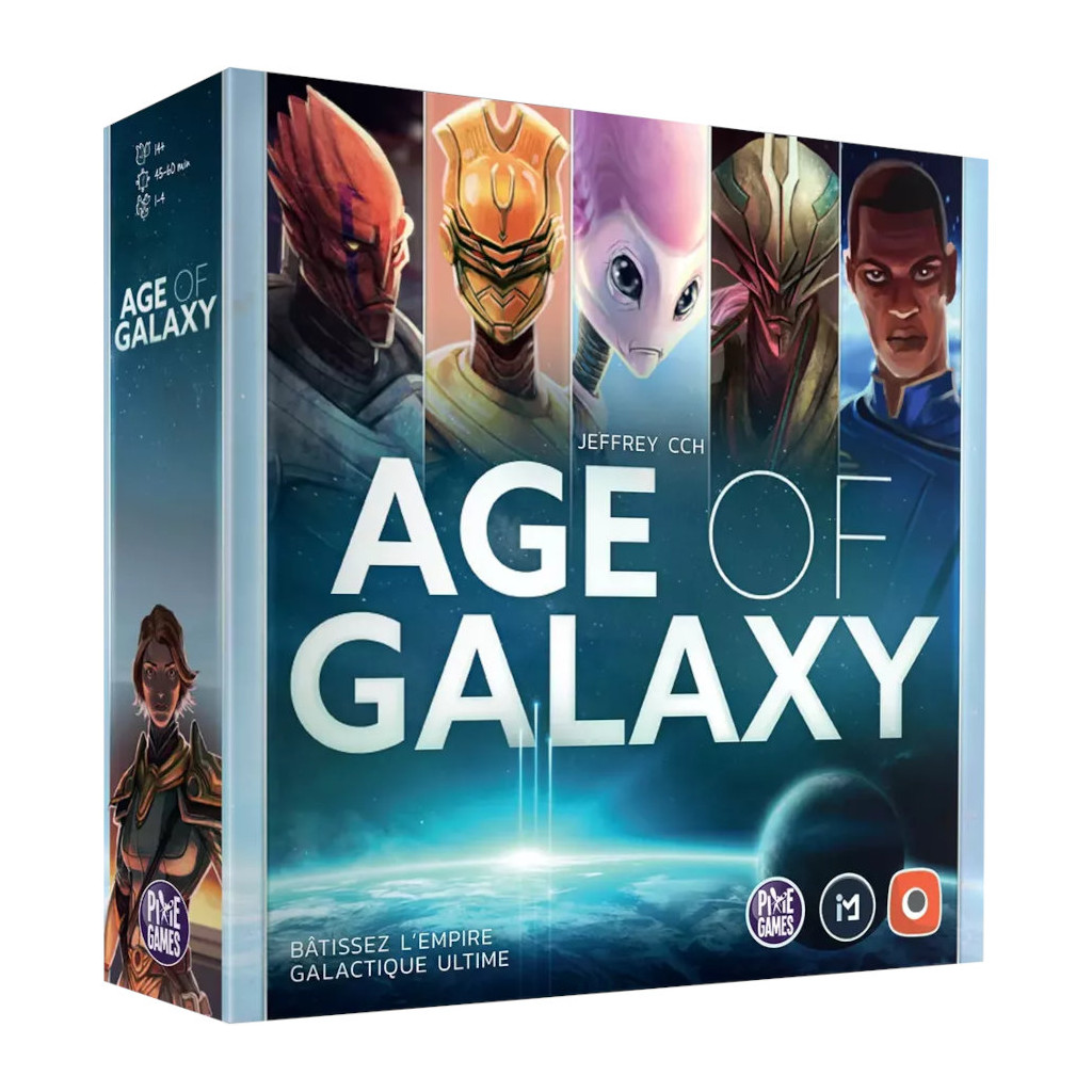 Age of Galaxy est un 4X dynamique dans lequel les joueurs s’opposent pour bâtir l’empire galactique ultime. Au début de la partie, chaque joueur dispose d’une main de cartes et n’en piochera plus ensuite. Chaque carte peut être utilisée de multiples façons : obtenir un bonus instantané, acquérir des capacités permanentes ou débloquer des opportunités de décompte. Que vous construisiez une flotte de vaisseaux, conquériez des planètes, développiez des technologies de pointe ou influenciez le Sénat Galactique, vous devrez choisir votre stratégie et l’adapter au mieux au cours de la partie.