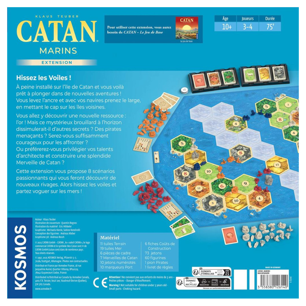 Prenez la mer et partez explorer de nouveaux horizons !Après avoir bâti vos routes, fondé vos villes et exploité les richesses de l’île de Catan, il est temps de prendre le large ! Construisez des navires, naviguez d’île en île et découvrez des territoires inédits remplis de nouvelles ressources et d’opportunités.Cette extension propose 8 scénarios formant un véritable voyage : chaque partie raconte un chapitre de l’exploration de Catan, avec règles spécifiques, objectifs variés et défis renouvelés. À vous d’élaborer des stratégies maritimes, d’optimiser vos déplacements et de négocier habilement… mais attention au bateau pirate, prêt à vous dérober vos ressources au pire moment !Cette nouvelle version "refresh" offre :- Un design modernisé- Une mise en page plus claire- Des règles simplifiées pour une meilleure prise en main