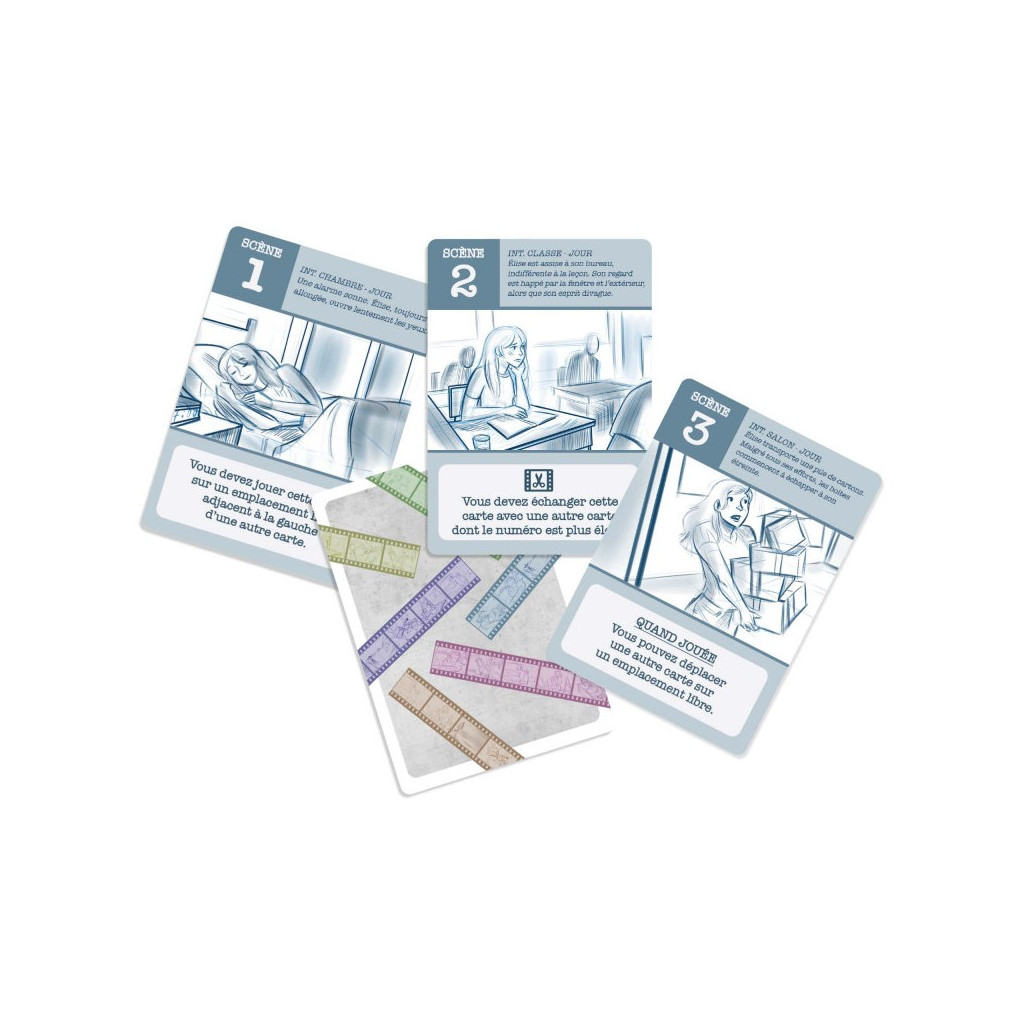 Dans Plan Séquence, les joueurs placent à tour de rôle les cartes de scène numérotées de leur main dans la ligne de chronologie partagée dans l'espoir de mettre les 6 cartes dans l'ordre. Le piège ? Ils ne peuvent pas se parler ni se faire signe !