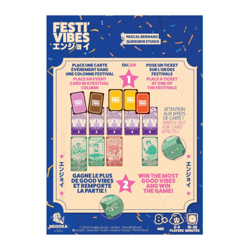 Planifiez vos prochains festivals et anticipez les surprises à chaque carte ! Vibrez au rythme des événements cool et imprévus qui pimentent vos festivals tout en maximisant vos good vibes ! Dans Festi’vibes, les joueurs vont devoir poser des cartes événements tout en choisissant les festivals auxquels ils souhaitent participer.