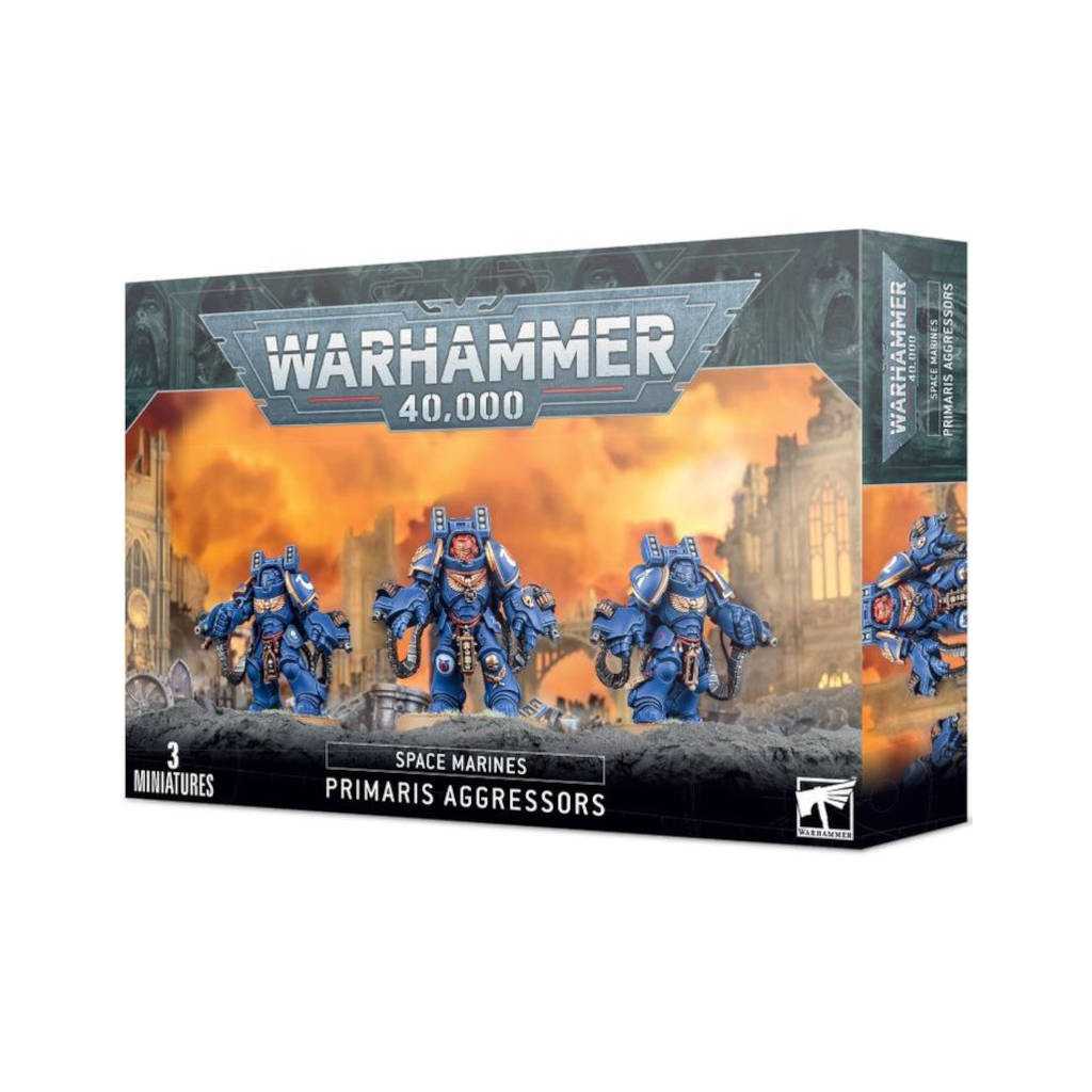 Cette boîte pour Warhammer 40K contient tout le nécessaire pour monter 3 Primaris Aggressors, une unité lourde et polyvalente pour les Space-Marines.