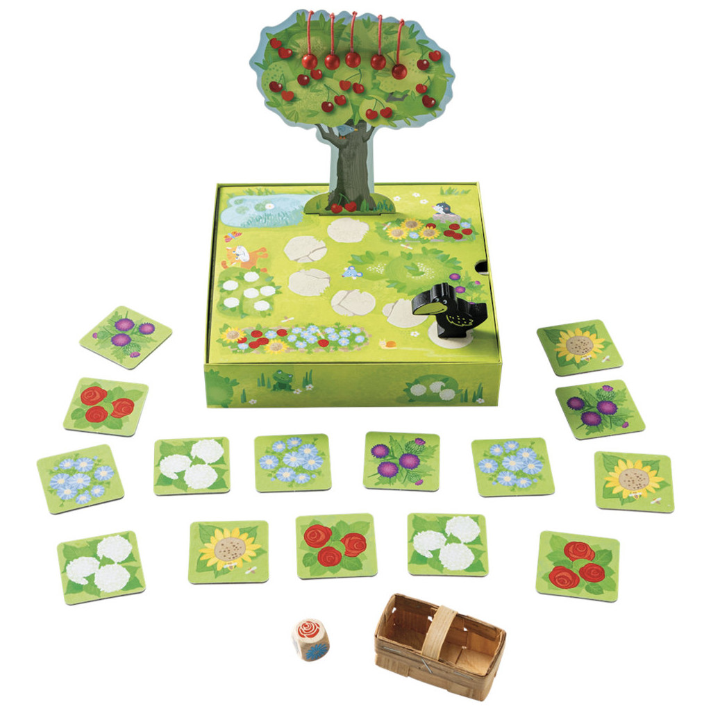 1 plateau de jeu avec cerisier, 1 corbeau, 5 cerises, 1 panier à fruits, 1 dé multicolore, 15 cartes « fleur », 1 règle du jeu.