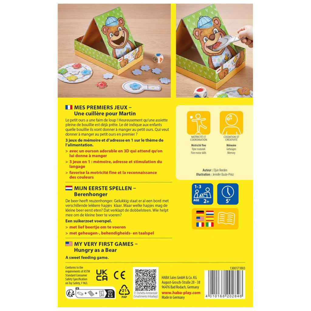 Le petit ours a faim, qui lui donnera à manger ?Trois jeux en un pour varier les plaisirs et les découvertes.Lancez le dé et posez la tuile de l’aliment sur la cuillère puis glissez-la dans la bouche de l’ourson. À la fin de la partie, la pile des aliments qui ont bien été mangés doit être plus grande que celle des aliments tombés de la cuillère. Un jeu d’adresse coopératif.