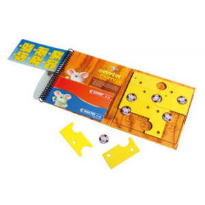 Les souris gloutonnes !Saurez-vous placer les morceaux de fromage magnétiques sur le plan de jeu de telle sorte que les têtes des souris apparaissent à travers les trous de la meule de gruyère ?Certains trous pourront rester vides, mais les demi-trous sont interdits, sauf s’ils sont disposés sur le pourtour du plan de jeu.48 défis et solutions pour 4 niveaux de difficultés.