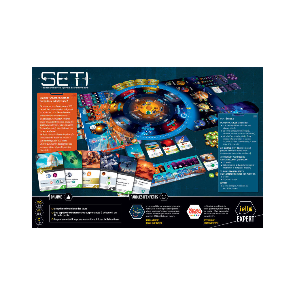 Vin d'jeu: La première chose qui m’a marqué et aussi beaucoup plu avec SETI, c’est qu’il est ultra thématique. Grâce à ses actions ancrées dans le thème et son superbe matériel, on se prend vraiment pour des scientifiques partis en quête de vie extraterrestre. Avec ses nombreuses actions principales et « gratuites », il offre de nombreuses possibilités en terme de jeu afin de répondre aux objectifs de fin de partie, aux petits objectifs en cours de partie et éventuels objectifs liés aux races extraterrestres. Sans être un brise neurones, il offre une belle complexité dans la conduite de ses actions car les ressources sont tendues et il faut en permanence faire des choix, notamment vis-à-vis des cartes que l’on ne peut malheureusement pas toutes activer. Il offre ainsi une profondeur de jeu et une courbe d’apprentissage très intéressantes. Une fois n’est pas coutume, je suis en phase avec l’engouement populaire autour de SETI. Même s’il ne propose pas des mécaniques révolutionnaires, il offre quelque chose d’original, de frais je trouve avec son approche extrêmement thématique et son plateau peu commun. Bref, je suis conquis et SETI est bien mon premier coup de cœur post-Spiel 2024!! Il est sur la rampe de lancement pour conquérir la galaxie ludique. Tous nos avis sur: https://www.vindjeu.eu/