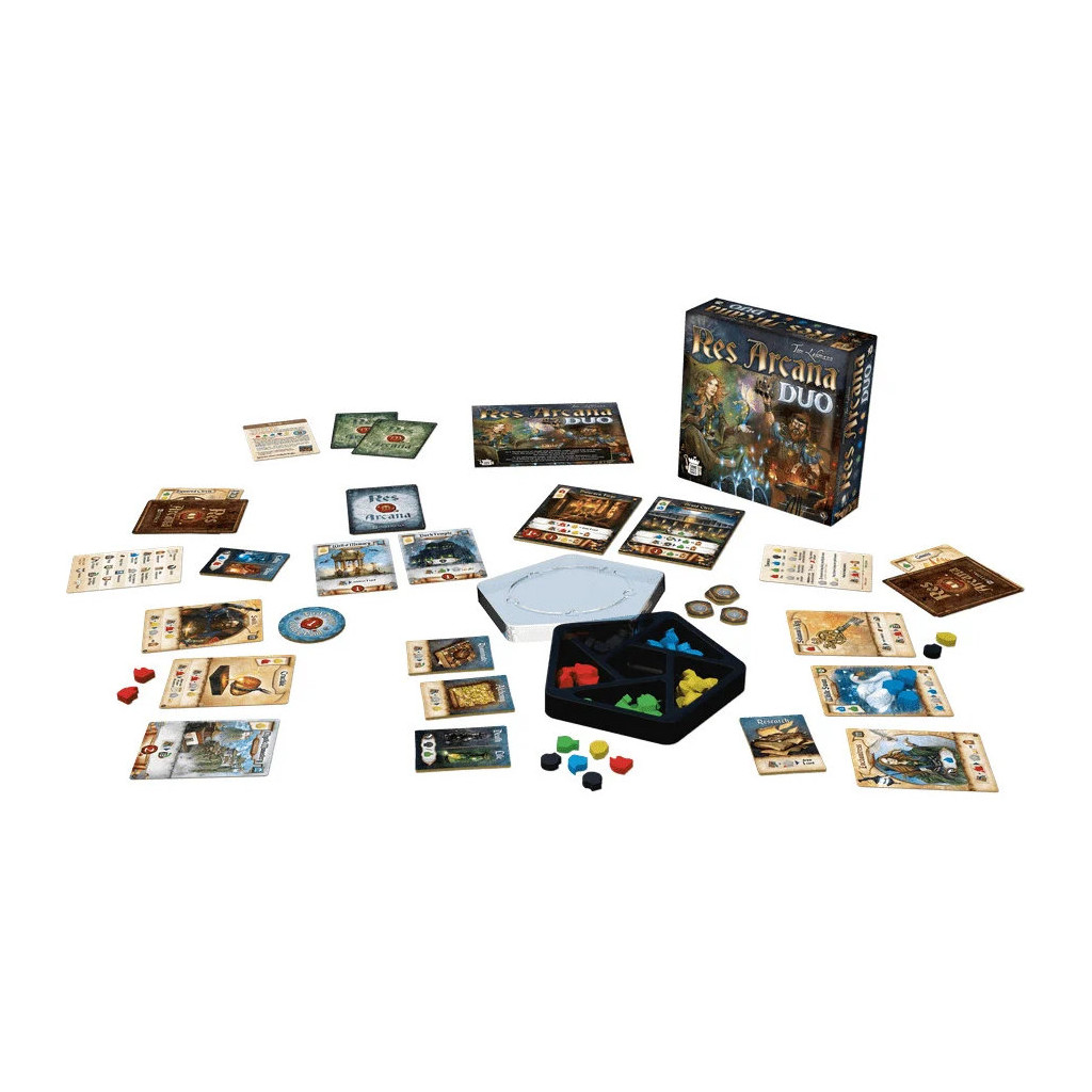 Res Arcana Duo est à la fois une extension de Res Arcana et un jeu autonome pour deux joueurs qui peut être combiné avec les extensions Lux et Tenebrae et Perlae Imperii de Res Arcana.