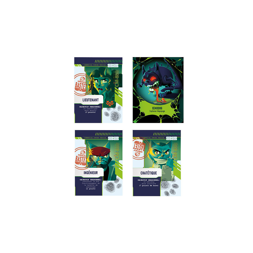 10 grandes tuilesSalles du vaisseau12 tuiles sas63 cartes14 jetons plexi2 tuiles Équipement6 tokens Larve6 standees1 tuile Xénodog1 règle du jeu 16 pages