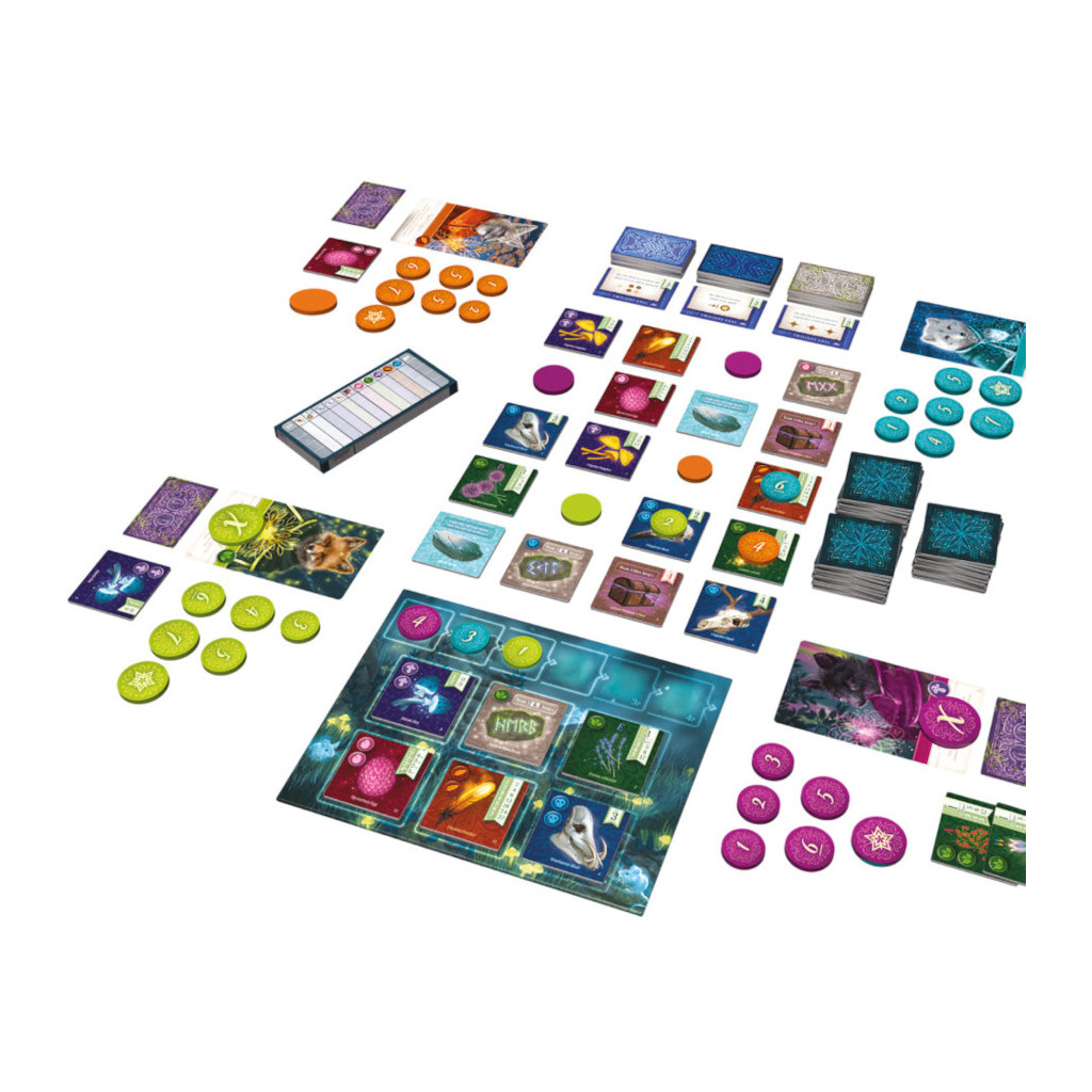 80 tuiles Objet44 jetons Sortilège en bois6 jetons Sortilège obscur en bois4 jetons Passe en bois1 bloc de score12 cartes Objectif crépuscule10 cartes Potion de départ1 plateau Esprits de la forêt24 cartes pour le mode solo12 cartes Objectif nuit35 cartes Potion4 cartes Druide1 livret de règles