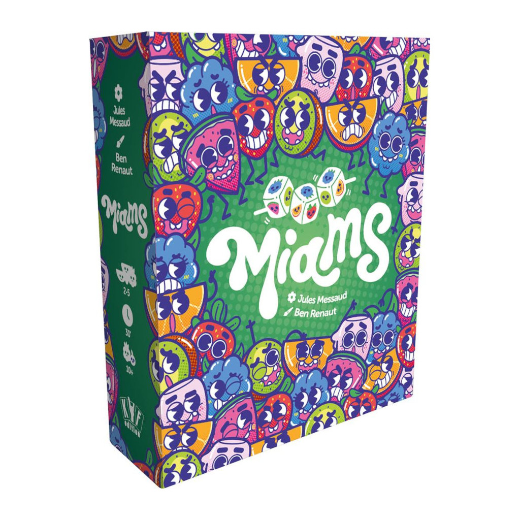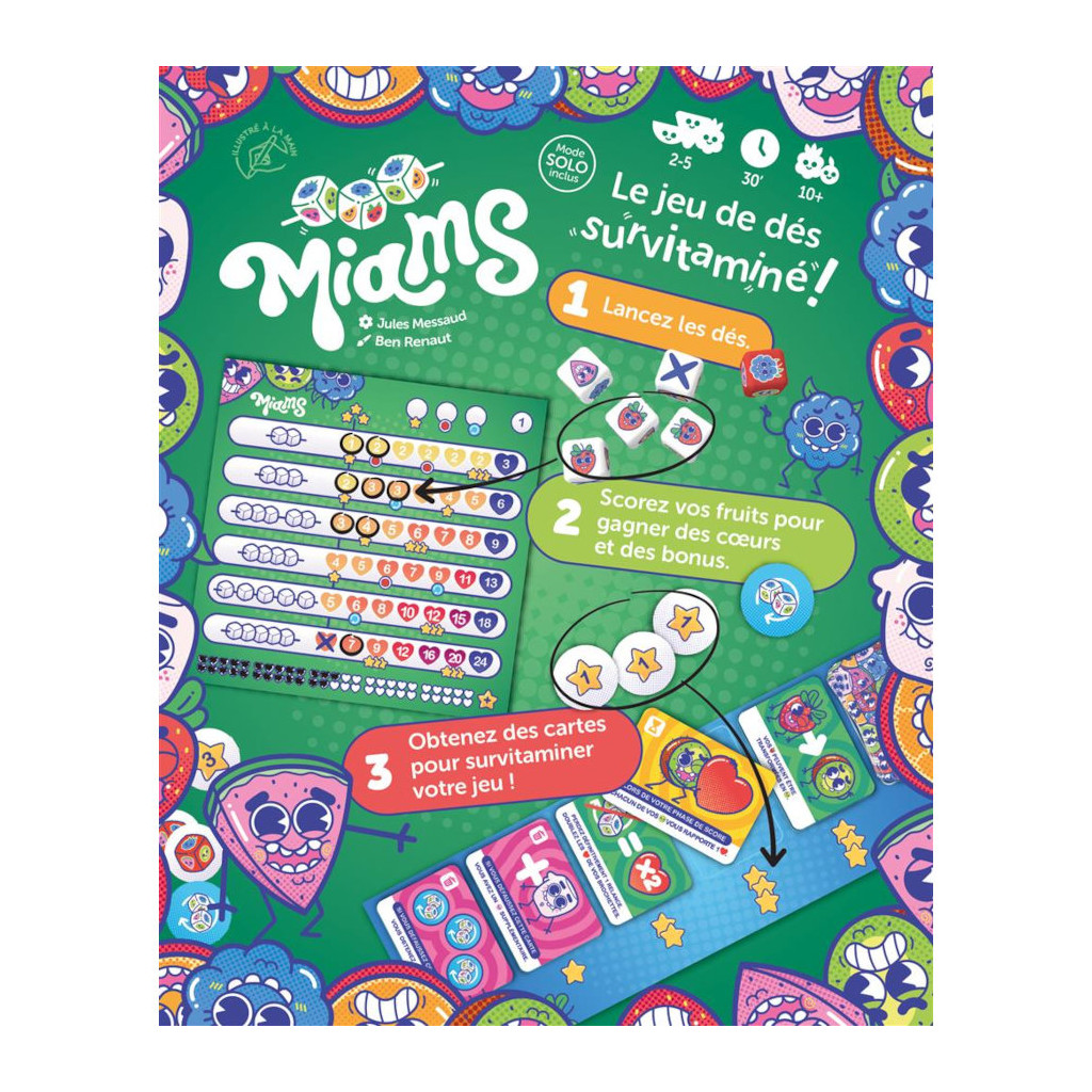 Dans Miams, lancez vos dés, composez des combinaisons de fruits (paire, brelan, full, carré, suite ou miams), puis cochez les cases de votre feuille pour marquer des points et des bonus. Le but : avoir coché 50 cœurs avant vos adversaires et marquer le maximum de points ! Chaque lancer vous offre des choix : quelles brochettes de fruits avez-vous le plus de chance de générer ? Quels dés relancer ? Faut-il utiliser le dé rouge bonus ? A chaque tour, vous pourrez aussi acheter des cartes Miams aux effets variés pour booster votre stratégie : effets permanents, bonus immédiats ou fin de tour... Pimpez votre jeu des bons effets pour enchaîner les combos !