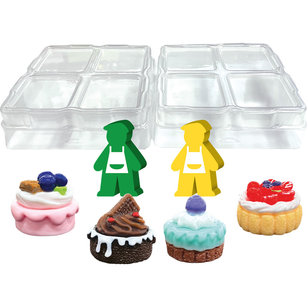 - 60 cartes Gâteau, - 30 cartes Commande, - 32 pions Gâteau, - 12 tuiles Amélioration (3 de chaque couleur), - 4 plateaux Joueur, - 2 meeples, - 2 bacs à Ingrédients, - 1 livret de règles.