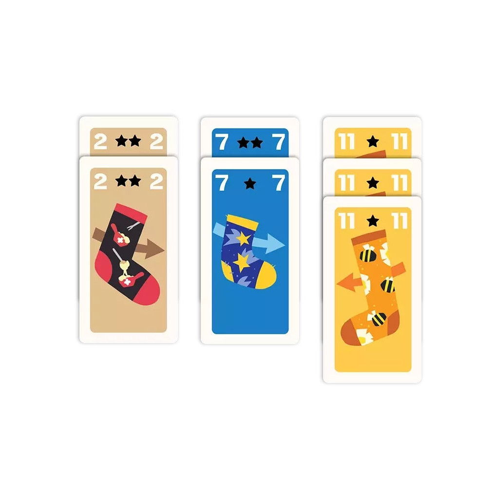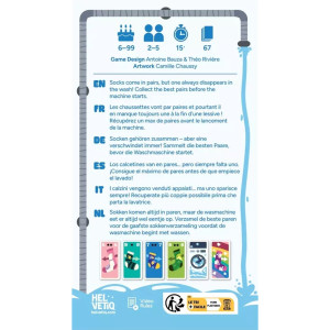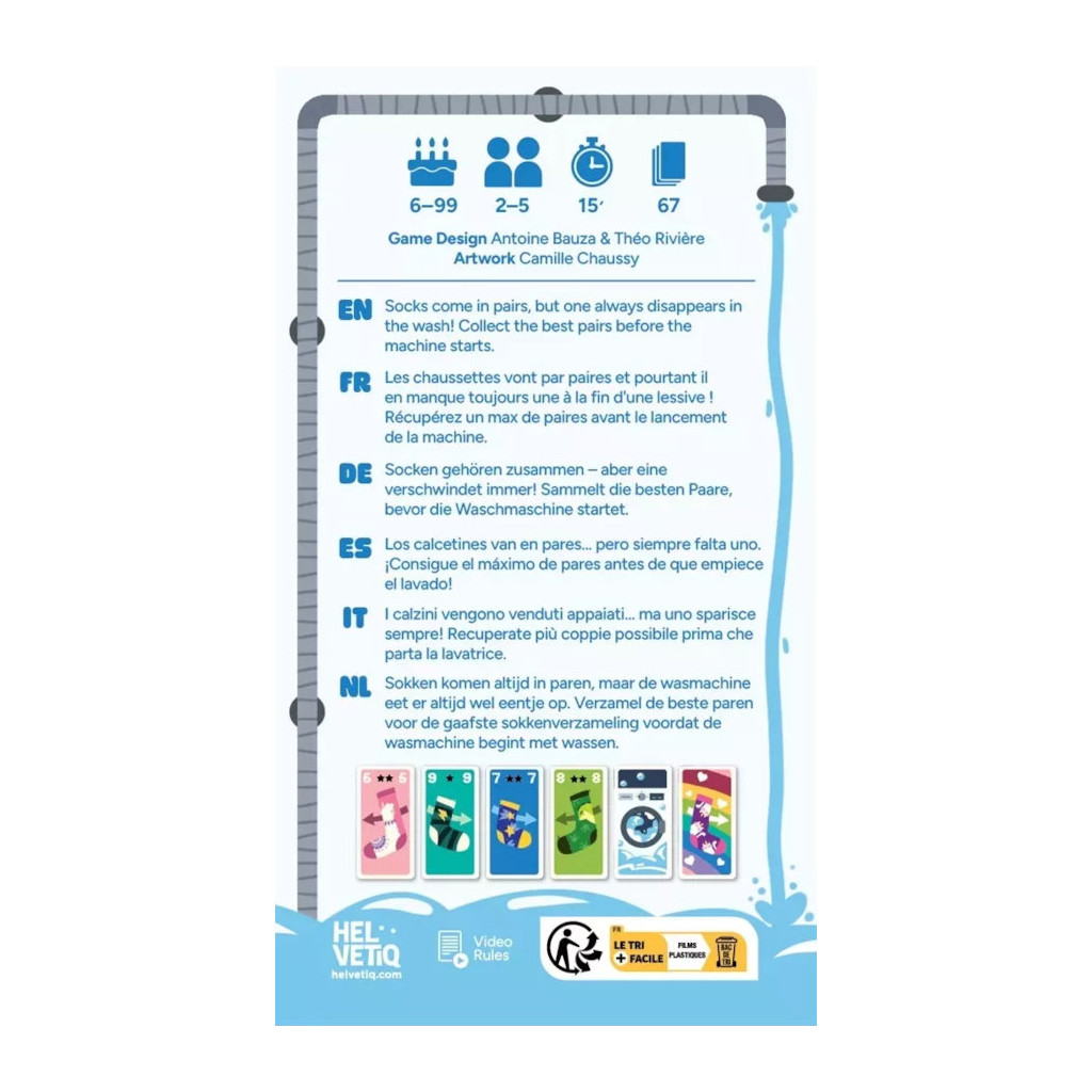 À chaque tour, piochez deux cartes, choisissez-en une que vous garderez tout en donnant l'autre à un voisin selon la direction de la flèche. Seules les paires de chaussettes correctement assorties vous rapporteront des points, alors planifiez bien vos déplacements, avant que la carte machine à laver ne vienne mettre fin à la partie !