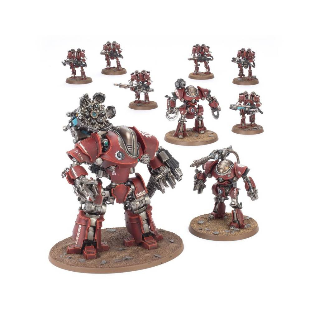 Le Mechanicum emploie en masse des esclaves dotés d'améliorations cybernétiques et des automates pour accomplir sa volonté sur le champ de bataille. Ces machines sont capables d'avancer et de combattre pendant des jours sans fatiguer, et elles sont incroyablement résistantes et équipées d'armes puissantes alimentées par leurs réacteurs internes.Si vous voulez conquérir la galaxie au nom de l'Omnimessie (que vous pensiez qu'il s'agit de l'Empereur ou pas), cette boîte est le moyen idéal d'entamer une nouvelle armée du Mechanicum ou d'étoffer une collection existante tout en faisant des économies par rapport à un achat des kits au détail. Vous trouverez une Cohorte Thallax équipée de puissants fusils à foudre, ainsi que deux Automates de Combat Castellax équipés d'une paire de chargeurs-choc semblables à des griffes et d'armes lourdes. Le gros costaud de la boîte est l'imposant Automate de Siège Thanatar Cavas. Son arme principale est un mortier à plasma monté sur l'épaule, capable de pulvériser vos ennemis à distance, avant de charger pour écraser les survivants avec ses chargeurs-choc.Cette boîte permet d'assembler 9 figurines en plastique :– 1x Automate de Siège Thanatar Cavas– 2x Automates de Combat Castellax– 6x ThallaxLes figurines de ce kit sont faciles à personnaliser. L'Automate de Siège Thanatar Cavas peut être assemblé selon votre préférence avec une pose parmi deux possibles, et son mortier à plasma dévastateur peut être assemblé ouvert ou fermé.Les deux Castellax peuvent être armés d'un canon à bolts Mauler, d'un multi-fuseur ou d'un canon Darkfire pour semer la destruction à longue portée, et au choix, de chargeurs-choc ou d'un arroi de lames énergétiques, chacun avec un lance-flammes ou un bolter intégré, pour déchiqueter les ennemis en mêlée.Les Thallax disposent chacun d'une baïonnette tronçonneuse en option pour leurs fusils à foudre, et vous trouverez 2x fusils à plasma phasé, 2x pulseurs à photons et 2x multi-fuseurs pour leur offrir une plus grande puissance de feu.Ce kit est composé de 598 éléments en plastique, de 1x Socle Ovale Citadel de 120mm, de 2x Socles Ronds Citadel de 60mm, de 6x Socles Ronds Citadel de 40mm, de 2x Planches de Décalcos de Macro-constructions du Mechanicum proposant chacune 394 décalcos de grande qualité, et de 2x Planches de Décalcos de Constructions du Mechanicum proposant chacune 558 décalcos de grande qualité pour personnaliser vos figurines.
