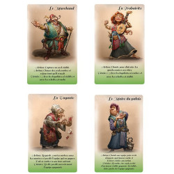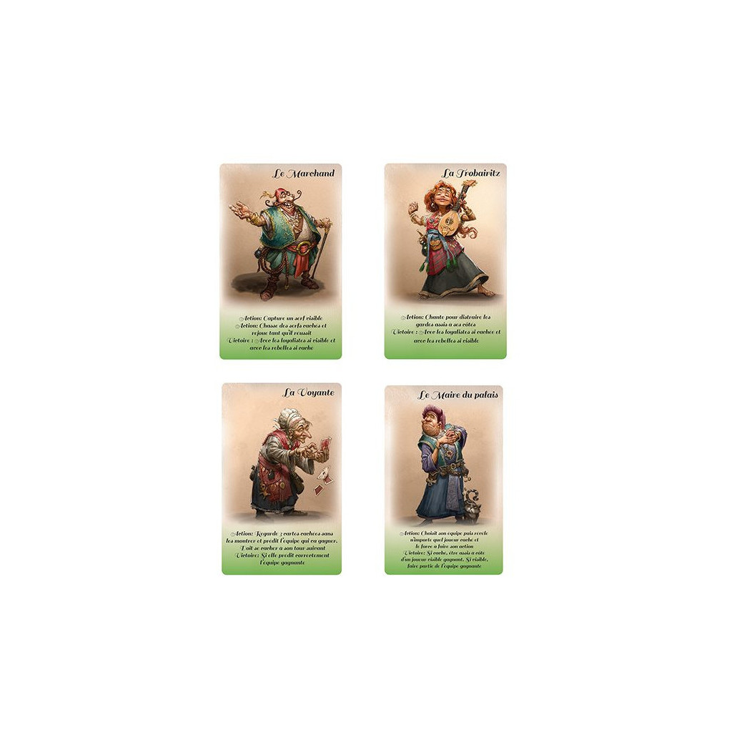 16 cartes personnages: 1 roi, 3 gardes, 3 assassins, 5 serfs, 1 voyante, 1 marchand, 1 maire du palais et 1 trobairitz (troubadouresse)15 cartes pièce d’or (règle optionnelle)10 cartes évènements (règle optionnelle)1 carte couronne3 cartes prison5 cartes chaînes2 cartes équipe loyaliste (drapeaux bleus)2 cartes équipe rebelle (drapeaux rouges)1 carte fatiguéLa règle du jeu
