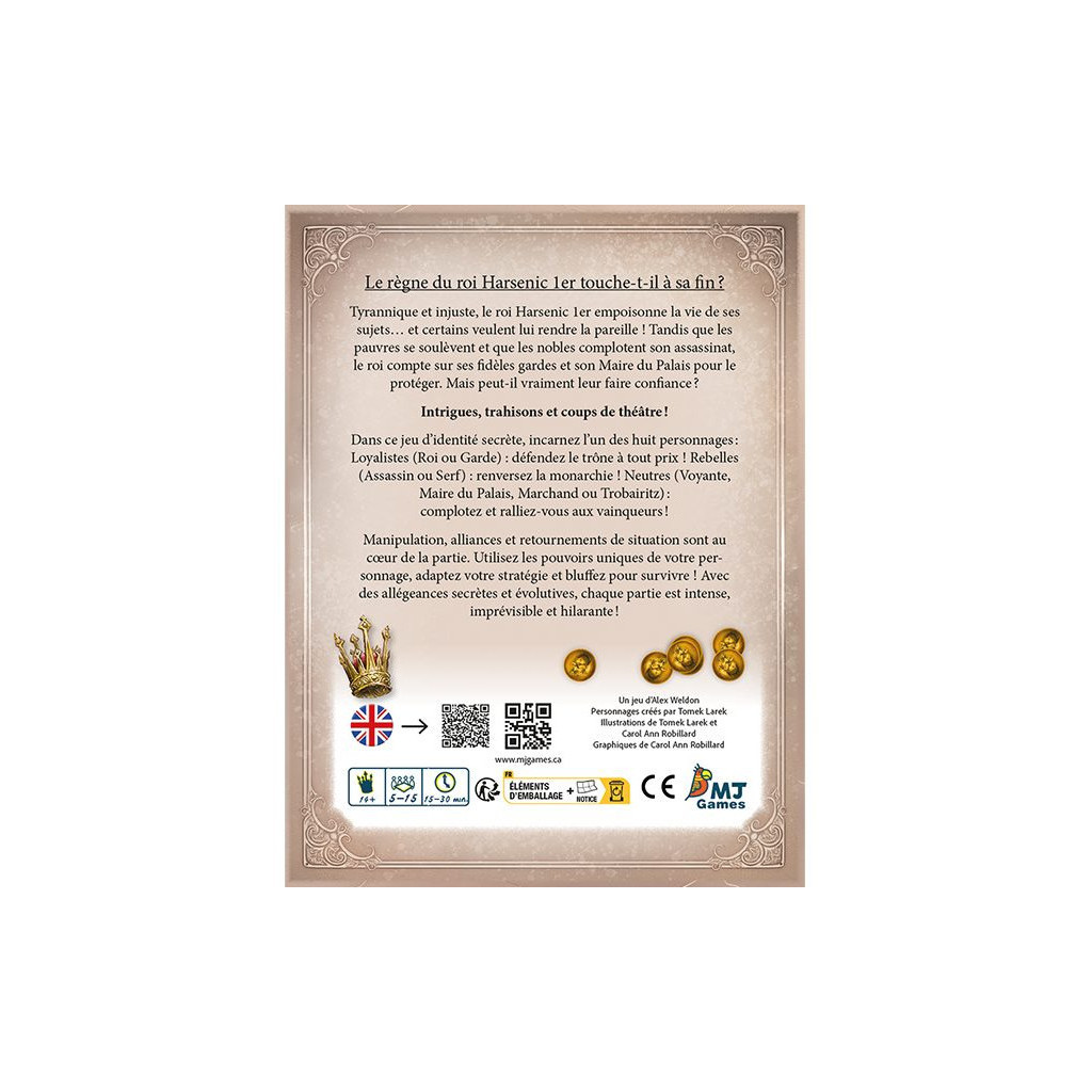 Tyrannique et injuste, le roi Harsenic 1er empoisonne la vie de ses sujets… et certains veulent lui rendre la pareille ! Tandis que les pauvres se soulèvent et que les nobles complotent son assassinat, le roi compte sur ses fidèles gardes et son Maire du Palais pour le protéger. Mais peut-il vraiment leur faire confiance ? Intrigues, trahisons et coups de théâtre ! Dans ce jeu d’identité secrète, incarnez l’un des huit personnages : Loyalistes (Roi ou Garde) : défendez le trône à tout prixb Rebelles (Assassin ou Serf) : renversez la monarchie, Neutres (Voyante, Maire du Palais, Marchand ou Trobairitz) : complotez et ralliez-vous aux vainqueurs !