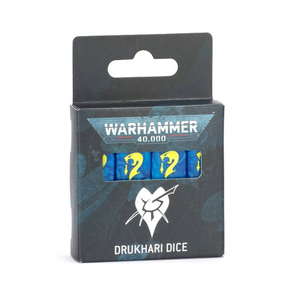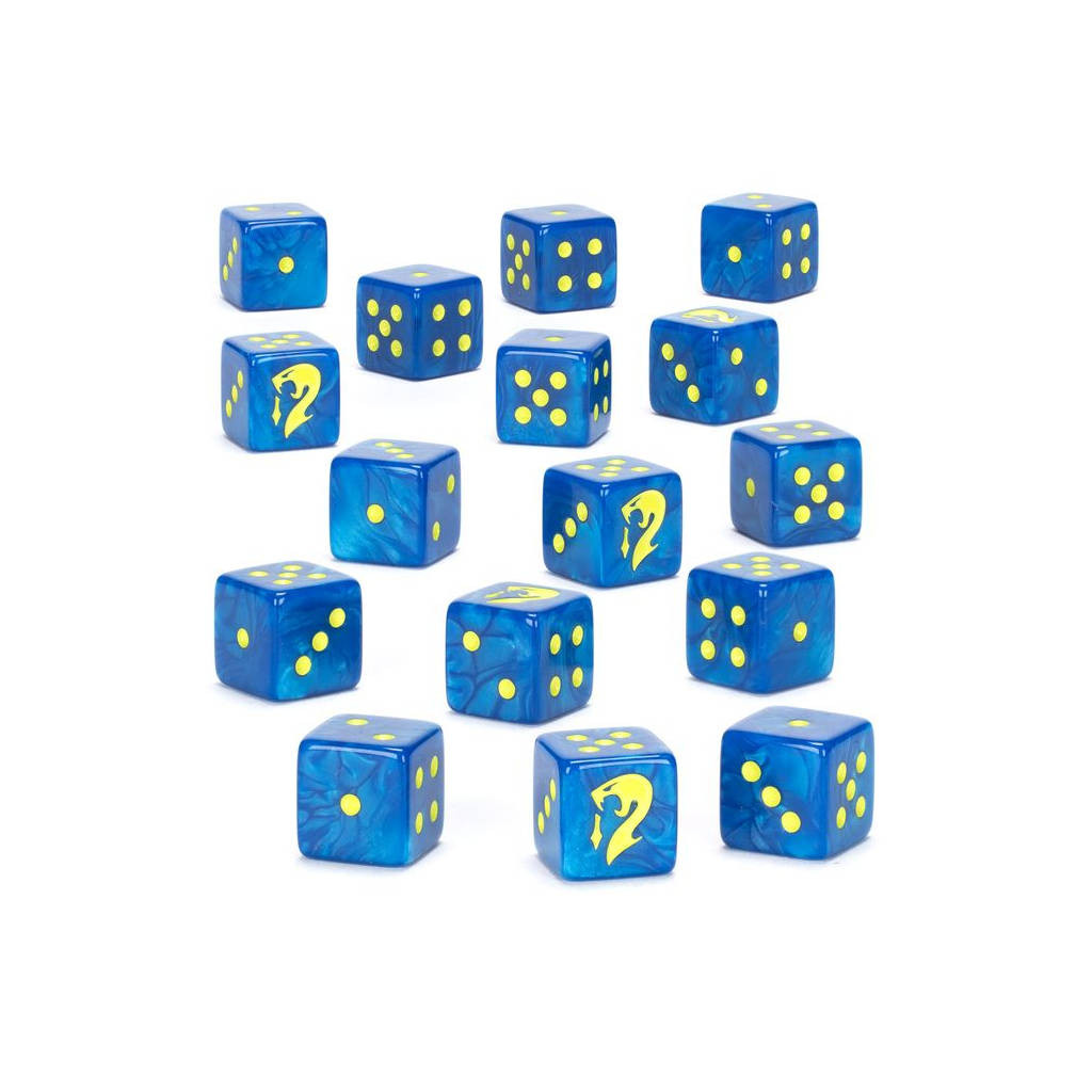 Les Drukhari incapables de se battre et de gagner deviennent vite la proie de ceux qui le peuvent. Maîtres du subterfuge et de la manipulation, ceux de la Kabale de la Langue Venimeuse, menés par Aurelia Malys, se font une spécialité de mieux manœuvrer et mieux réfléchir que leurs victimes. Partout où s'enfoncent les Crochets de Malys, confusion et calamités s'ensuivent.Ce set de 16 dés aux arêtes carrées pour les parties de Warhammer 40,000 est sur le thème des Drukhari. Ils sont moulés en plastique acrylique bleu nacré avec des marquages jaunes et mesurent 16mm de côté. Les faces 1 à 5 sont numérotées de manière traditionnelle et chaque face du 6 porte l'icône de la Kabale de la Langue Venimeuse.