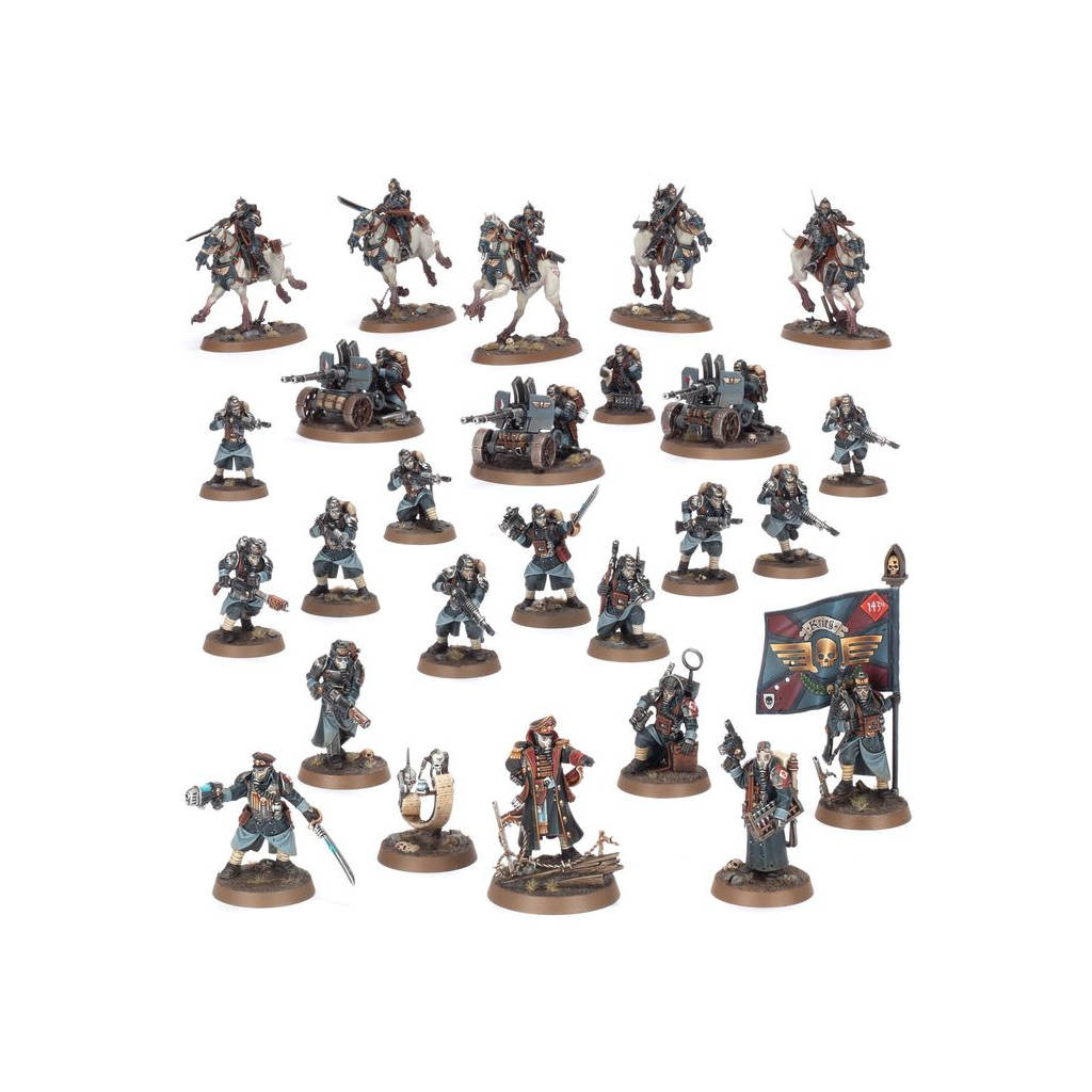 Le Death Korps de Krieg ne reculera devant rien pour démontrer sa loyauté à l'Imperium, et sacrifiera les vies de ses hommes dans des guerres d'attrition brutales. Il peut se fier au poids du nombre, à un état d'esprit inflexible concernant la guerre et le sacrifice, et se reposer sur l'emploi d'armes de siège lourdes pour user l'adversaire.Si vous comptez vous sacrifier au nom de l'Empereur-Dieu, cette boîte est le moyen parfait d'entamer une nouvelle collection du Death Korps de Krieg ou d'agrandir une armée existante tout en faisant des économies par rapport à un achat des kits au détail. Une Escouade d'État-major mène la charge et une escouade d'infanterie fiable lui emboîte le pas. Des armes lourdes fournissent le tir de couverture tandis que des Cavaliers de Krieg prennent l'ennemi de flanc, prêts à frapper sabre au clair. Ces 26 figurines en plastique représentent une force complète de l'Astra Militarum à utiliser dans les parties de Patrouille, un format réduit et tactique de Warhammer 40,000.Cette boîte permet d'assembler 26 figurines en plastique de l'Astra Militarum :– 5x Cavaliers de Krieg– 4x figurines d'Escouade d'Armes Lourdes de Krieg– 10x soldats du Death Korps du Krieg– 7x figurines d'Escouade d'État-major de KriegLes figurines de cette boîte sont faciles à personnaliser. Les Cavaliers de Krieg peuvent chacun être armés d'un sabre énergétique, d'une lance Frag ou d'une carabine de Cavalier de Krieg. Vous disposez des éléments nécessaires pour assembler un chef d'escouade optionnel, ainsi que de nombreux éléments esthétiques, incluant différents modèles d'étuis.Les servants de l'Escouade d'Armes Lourdes peuvent être postés auprès d'un canon laser, d'un lance-flammes lourd de Krieg ou d'une mitrailleuse de Krieg jumelée, et dotés de paquetages et d'accessoires interchangeables. Le Coordinateur de Tir peut être assemblé soit à genoux, soit en train de consulter une carte du champ de bataille.L'escouade du Death Korps de Krieg inclut les éléments nécessaires pour assembler un Maître du Guet optionnel pouvant être armé d'un pistolet à plasma, d'un pistolet laser ou d'un pistolet bolter, et d'une épée tronçonneuse ou d'une arme énergétique. Une figurine peut être assemblée comme un sniper, une autre avec un lance-flammes, une avec un lance-grenades et une avec un fusil à plasma ou un fuseur. Un membre de l'escouade peut recevoir un émetteur vox, un autre un médipac, et vous disposez d'accessoires esthétiques incluant des baïonnettes, des outils de tranchée, des étuis de ceinture et des grenades.Le Seigneur Commissaire de l'Escouade d'État-major peut être doté d'un pistolet à plasma ou d'un fouet pour le bras droit, et d'un gantelet énergétique ou d'une épée énergétique rangée au fourreau et d'une main pointant le doigt pour l'autre bras. Un des Gardes Impériaux Vétérans de l'unité peut être assemblé avec un pistolet laser, un pistolet bolter ou un pistolet à plasma dans la main droite, et une épée tronçonneuse, une arme énergétique ou une matraque de tranchée dans la main gauche. Un autre Garde Impérial peut apporter au combat un bolter, un fusil à plasma, un fuseur ou un lance-grenades. Les Gardes Impériaux restants portent respectivement l'étendard régimentaire, un vox de maître et des contre-agents alchymiques. Vous disposez aussi d'un ensemble d'accessoires esthétiques optionnels, incluant des pelles, pour décorer davantage vos figurines.Ce kit est composé de 803 éléments en plastique, de 1x Socle Rond Citadel de 32mm, de 17x Socles Ronds Citadel de 25mm, de 5x Socles Ovales Citadel de 60x35,5mm, de 3x Socles Ronds Citadel de 50mm et de 1x Planche de Décalcos du Death Korps de Krieg proposant 803 décalcos de grande qualité pour décorer vos figurines.