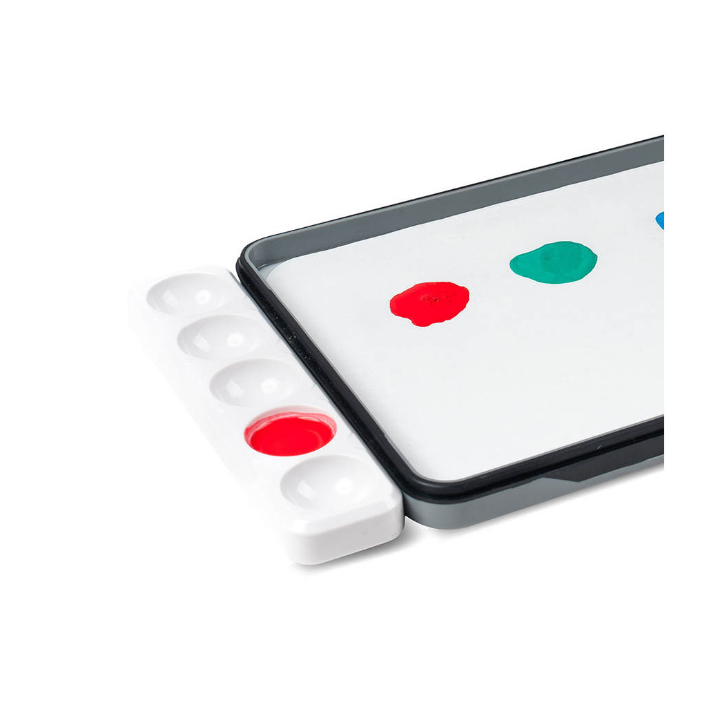 Fabriquée en plastique ABS, elle comporte 5 godets pour mélanger ou diluer les couleurs, ce qui permet de gagner de la place surle papier. Elle se fixe sur les côtés de la base de la palette humidegrâce à des aimants.