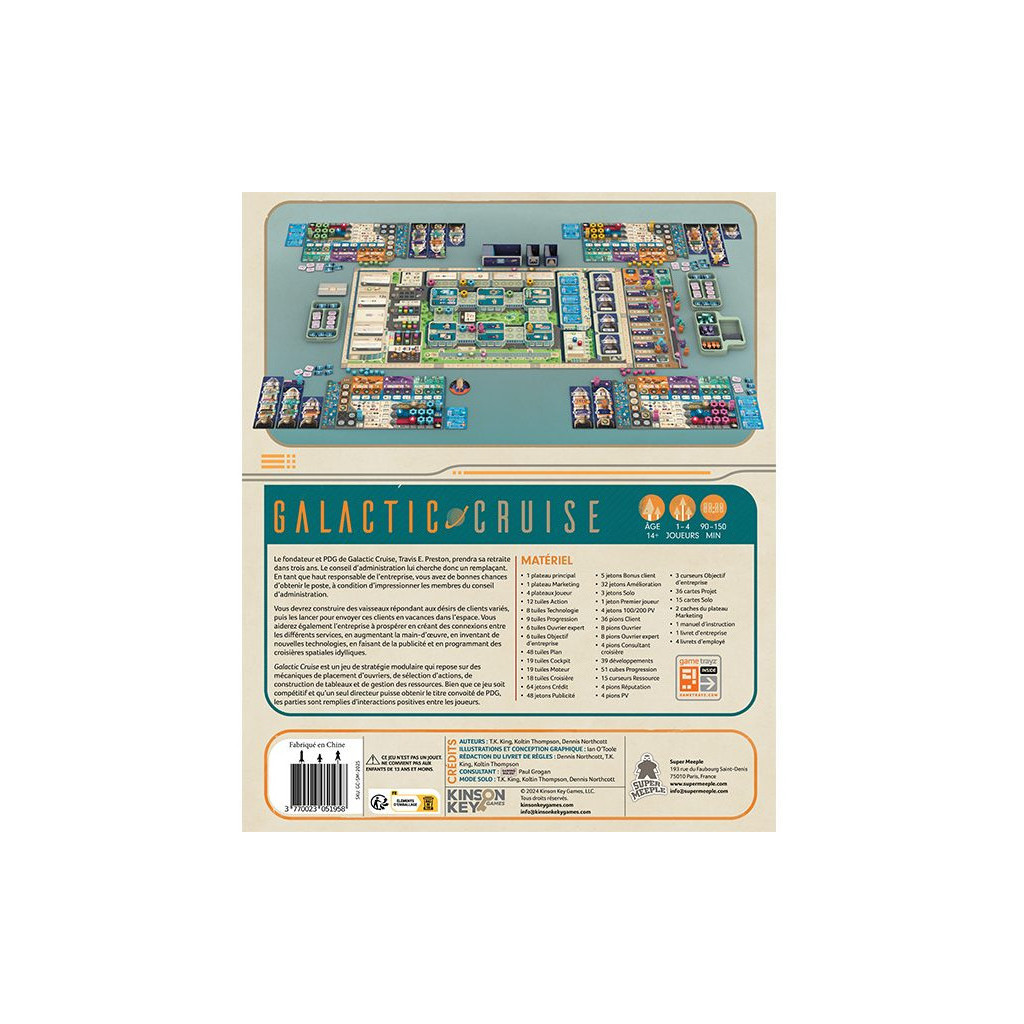Galactic Cruise est un jeu de stratégie modulaire qui repose sur des mécaniques de placement d’ouvriers, de sélection d’actions, de construction de tableaux et de gestion des ressources.