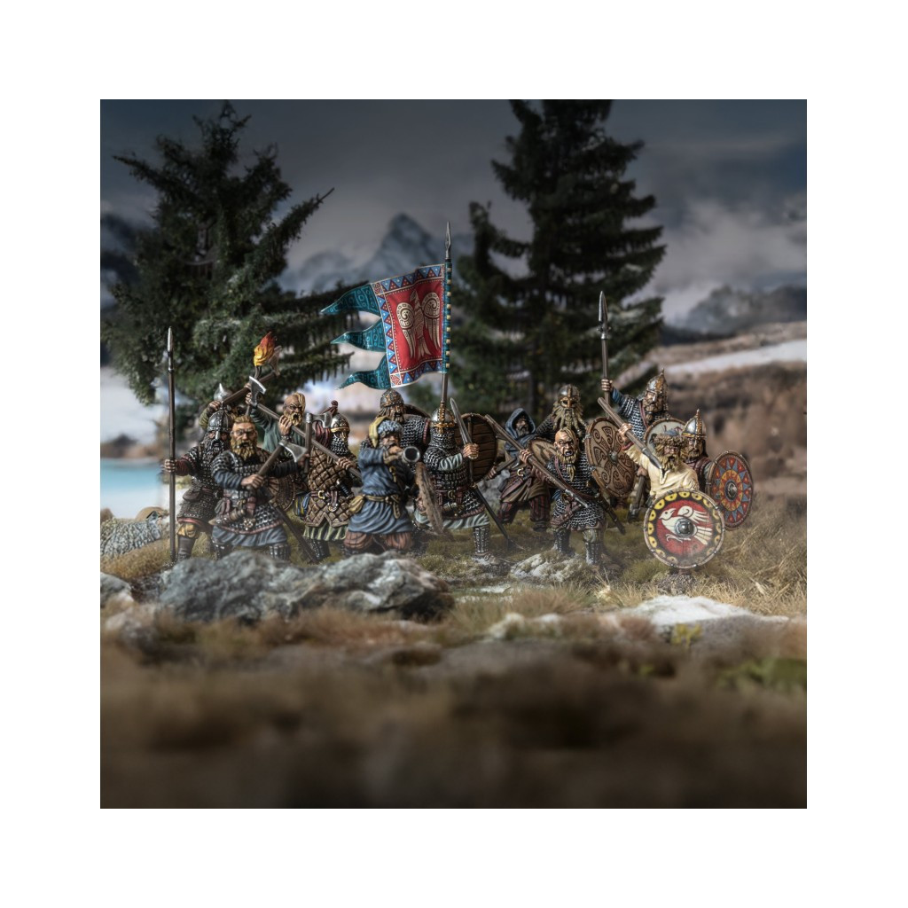 - 48 figurines d'une qualité exceptionnelle - 24 figurines en armure et 24 figurines sans armure- 37 têtes uniques - 148 têtes au total- Des lances, des épées, des haches à main et d'imposantes haches à deux mains.- Pièces pour figurines de commandement, y compris des souffleurs de cor et des porteurs d'étendards