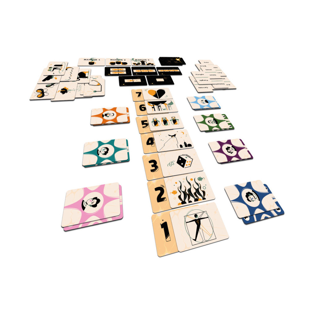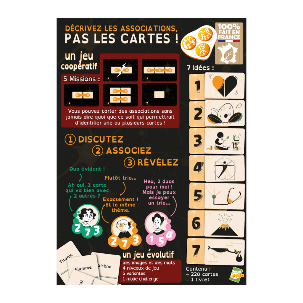 En début de manche, plusieurs cartes Mission et 7 cartes Idée (images ou mots) sont posées sur la table. Ensemble, vous allez décider quelle mission accomplir et quelles cartes Idée lui associer. Vous pouvez parler librement des missions, mais en aucun cas vous ne pouvez dire quoi que ce soit qui permette aux autres joueurs d’identifier une ou plusieurs cartes Idée : il faut évoquer les liens, les associations, sans jamais identifier une carte avec certitude. C’est là que tout se joue : comprendre les autres, être compris, et espérer que la majorité pense à la même combinaison que vous !