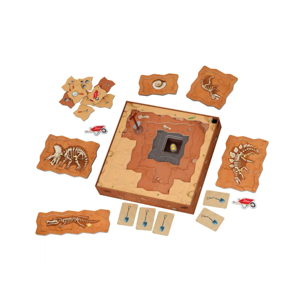 1 terrain de fouilles, 50 tuiles Terrain, 4 tuiles Découverte, 5 plateaux Fossile, une pelle ventouse, 3 œufs en bois, 1 jeton hexagonal, 5 jetons Brouette, 11 cartes, la règle du jeu