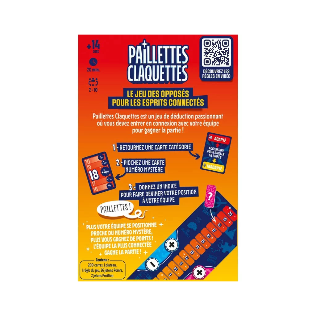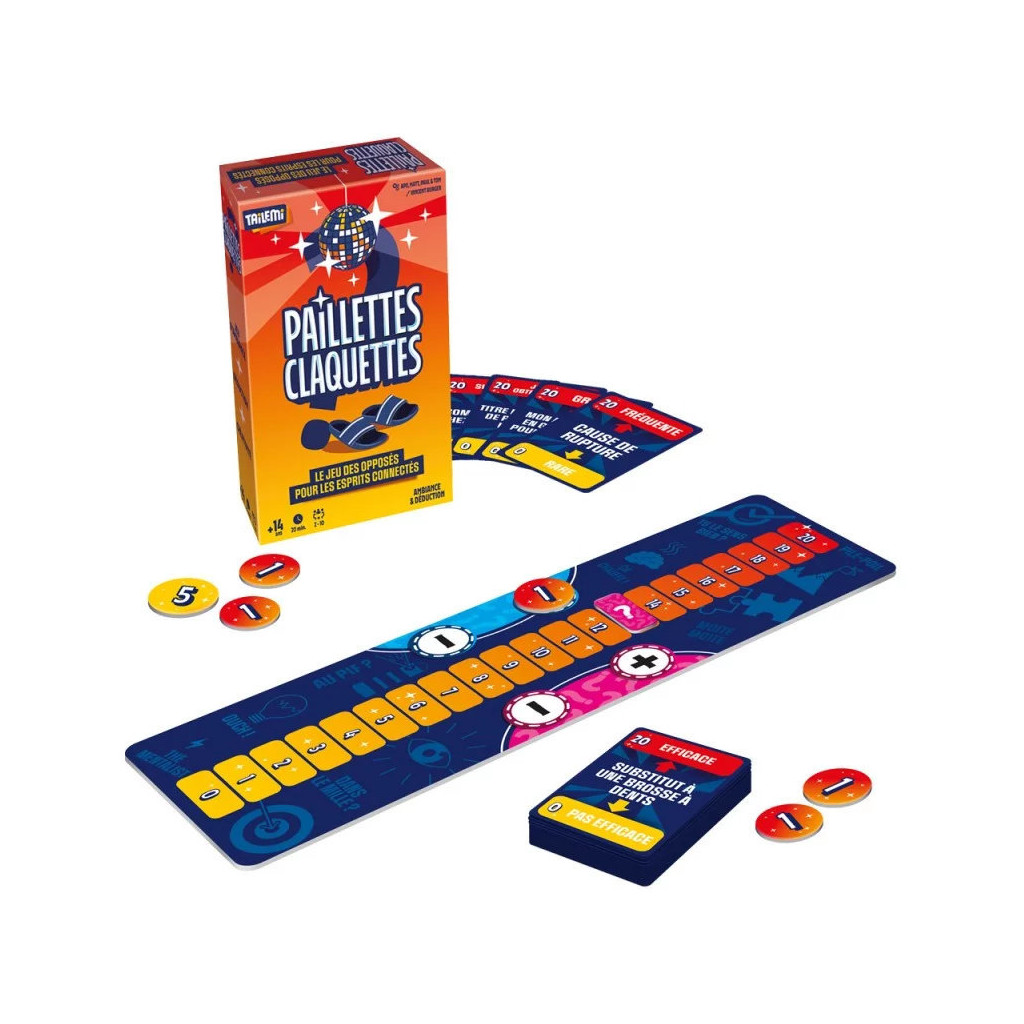 Paillettes Claquettes est un jeu d'ambiance et de déduction dans lequel les joueurs doivent deviner une position mystère sur une échelle de 0 à 20 à partir d’un simple indice. Il offre des parties rythmées et pleines d’échanges.
