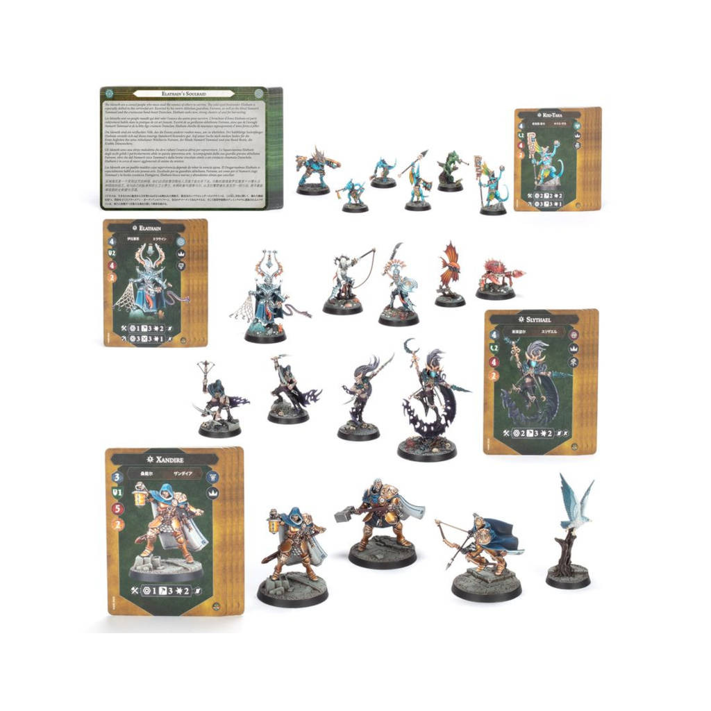 Partout où se déchaînent les forces de la Destruction, du Chaos et de la Mort, des agents de l'Ordre se dresseront pour les repousser. Ils se battent pour récupérer leur terres et leur gloire, et bien souvent au nom de Sigmar.Ce kit rassemble quatre bandes sur le thème de l'Ordre pour Warhammer Underworlds. Toutes les figurines sont à emboîter, moulées en plastique coloré, et intègrent des socles scéniques afin que vous puissiez rapidement commencer à jouer. Vous y trouverez également des cartes de charte et des cartes de combattant pour chaque bande. Les Rejetombres sont une bande de Frappe agressive, les Mythoclastes de Xandire sont une bande Polyvalente, les Traqueurs Solaires sont une robuste bande de style Prendre et Tenir et les Pillemânes d'Elathain offrent un style de jeu de Maîtrise, qui récompense une gestion minutieuse.Cette boîte contient les 19 figurines suivantes :– 4x figurines des Mythoclastes de Xandire – Calthia Xandire, Dhoraz, Luxa et Taros– 4x figurines des Rejetombres – Slythael, Drusylla, Sylarc et Valyssa– 6x figurines des Traqueurs Stellaires – Kixi-Taka, Klaq-Trok, Huachi, Xepic, Tok et Otapatl– 5x figurines des Pillemânes d'Elathain – Elathain, Fuirann, Tammael, Duinclaw et un Poisson-voilierLa boîte contient également :– 19x cartes de combattant double-face– 16x cartes de charte double-face (en Anglais, Français, Allemand, Espagnol, Italien, Chinois, et Japonais)Les cartes de combattant double-face mesurent 63mm x 88mm, et les cartes de charte double-face mesurent 105mm x 148mm.Ce kit contient 97 éléments en plastique, dont des socles scéniques intégrés