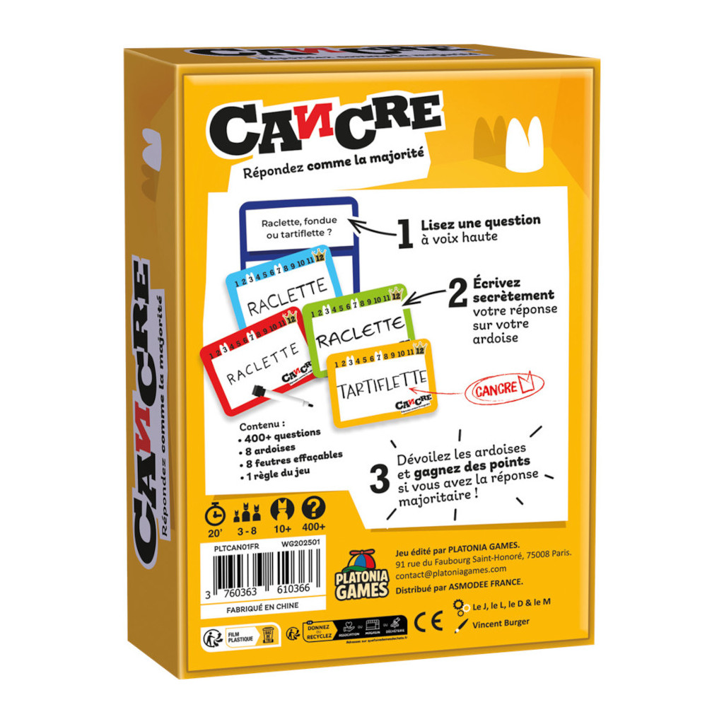 Cancre est un jeu d’ambiance pour 3 à 8 joueurs autour d'un concept simple : répondre comme la majorité. À chaque tour, un joueur lit une question à voix haute (ex. : « Raclette, fondue ou tartiflette ? »). Les autres écrivent leur réponse secrètement sur leur ardoise. Ensuite, tout le monde révèle sa réponse.