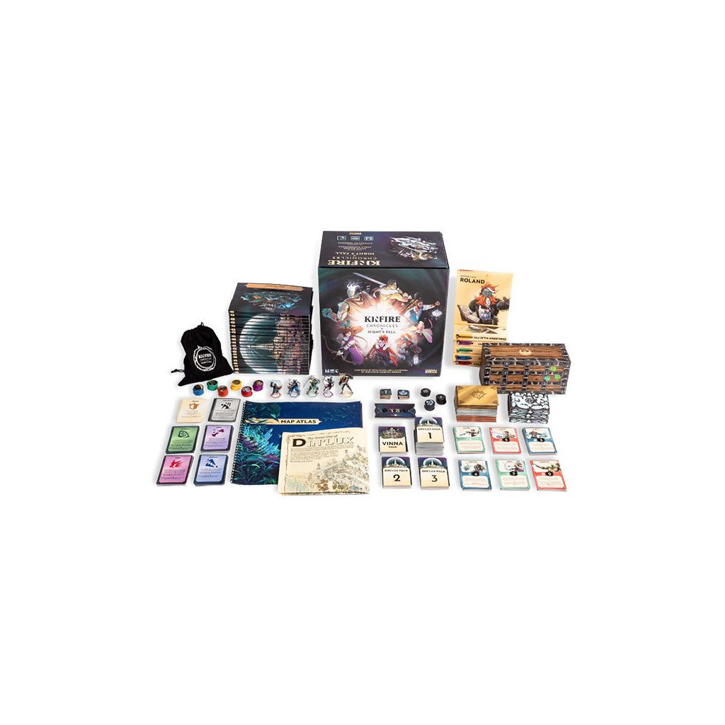 Kinfire Chronicles: Night’s Fall est un jeu de campagne coopératif épique pour 1 à 4 joueurs proposant 21 quêtes narratives, plus de 46 ennemis uniques et des centaines d’options de construction de deck, le tout regroupé dans un système de stockage ingénieux pour une installation et un rangement rapides. Sans préparation, les joueurs peuvent se plonger dans cette aventure riche en 15 minutes seulement et terminer une quête en moins d’une heure. Plébiscité et conçu par les créateurs de Descent et Arkham Horror, ce jeu primé vous donnera envie de revenir pour une narration toujours plus épique et un gameplay dynamique !
