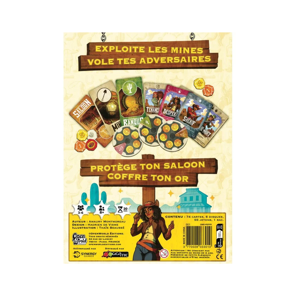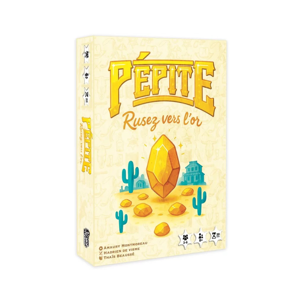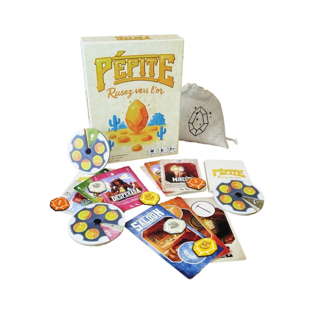 Dans Pépite, gérez une ville du Far West, incarnez ses personnages principaux et rusez vers l'or pour faire fructifier votre butin. Chaque tour, jouez en simultané un personnage et un lieu d’action (mine, saloon adverse ou banque). Transportez l’or, volez vos adversaires ou protégez votre ville ! Attention : chaque personnage ne peut être utilisé qu’une seule fois par manche et les mines peuvent sauter à tout moment. À partir de la 2e manche, de nouveaux personnages enrichissent vos options.