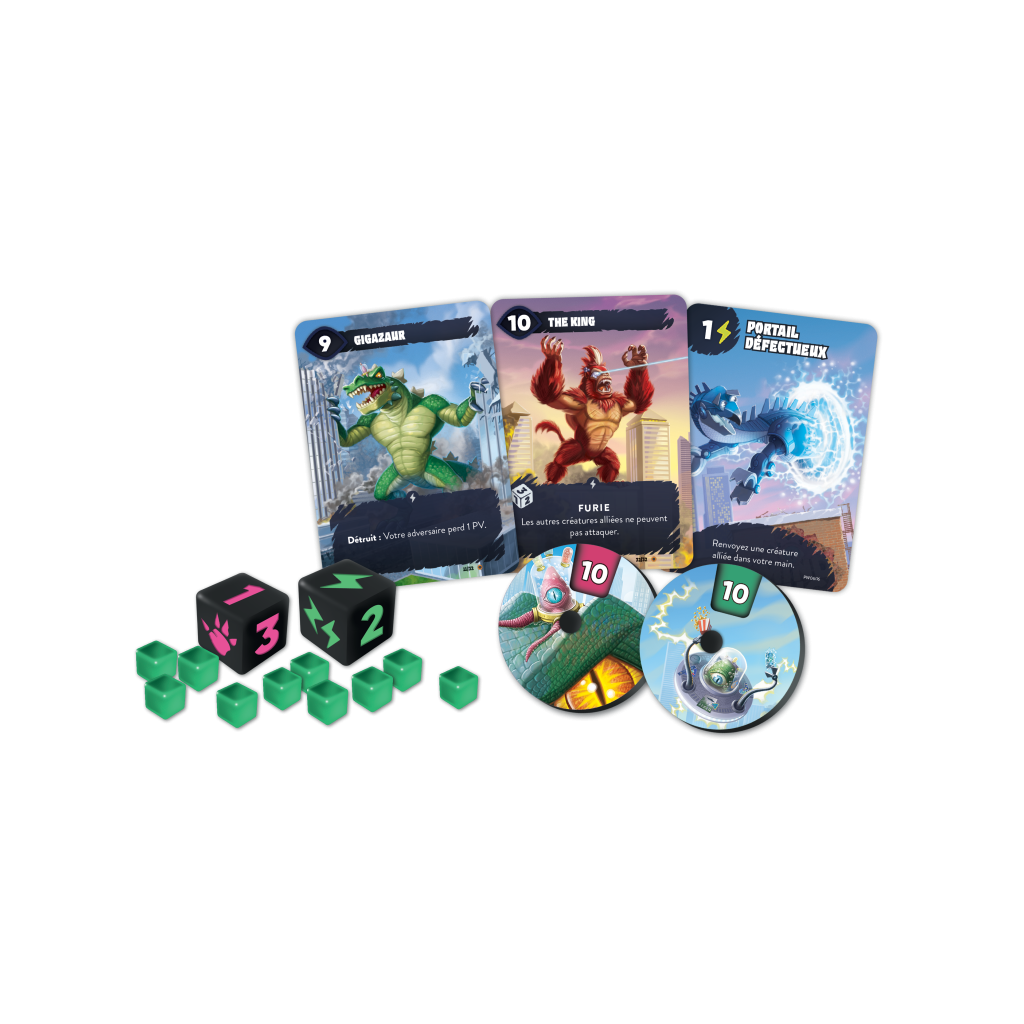 2 compteurs Santé, 16 cartes Énergie, 4 aides de jeu, 4 cartes Mindbug, 32 cartes Créature, 2 dés, 20 cubes d'Énergie et 1 livret de règles.
