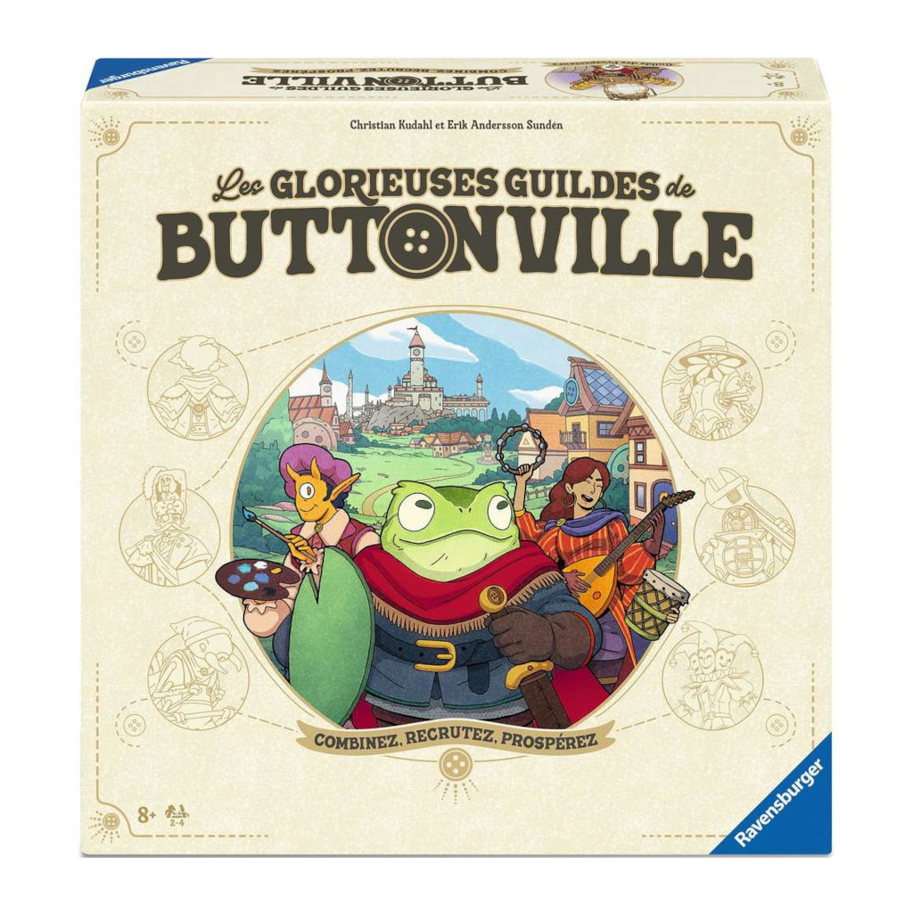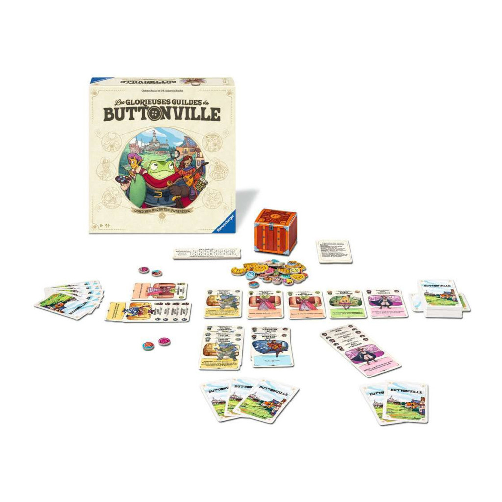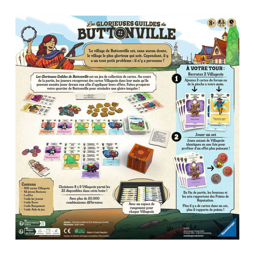 Dans Les Glorieuses Guildes de Buttonville, vous recrutez un maximum de Villageois afin de former les plus grands ensembles de citoyens identiques et de profiter pleinement de leurs capacités. À votre tour, recrutez 2 Villageois du forum ou de la pioche, puis vous pouvez jouer plusieurs cartes du même Villageois pour constituer un set. La plupart des Villageois ont un effet lorsque vous jouez leur set : plus vous jouez de Villageois identiques, plus l'effet est puissant.
