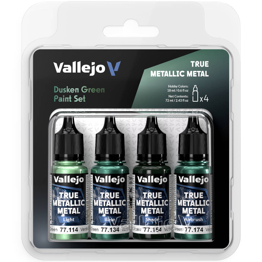 Ce Set Dusken Green de la marque Vallejo vous propose 4 Teintes de la gamme True Metallic Metal offrant un choix facile de nuances pour peindre vos figurines.