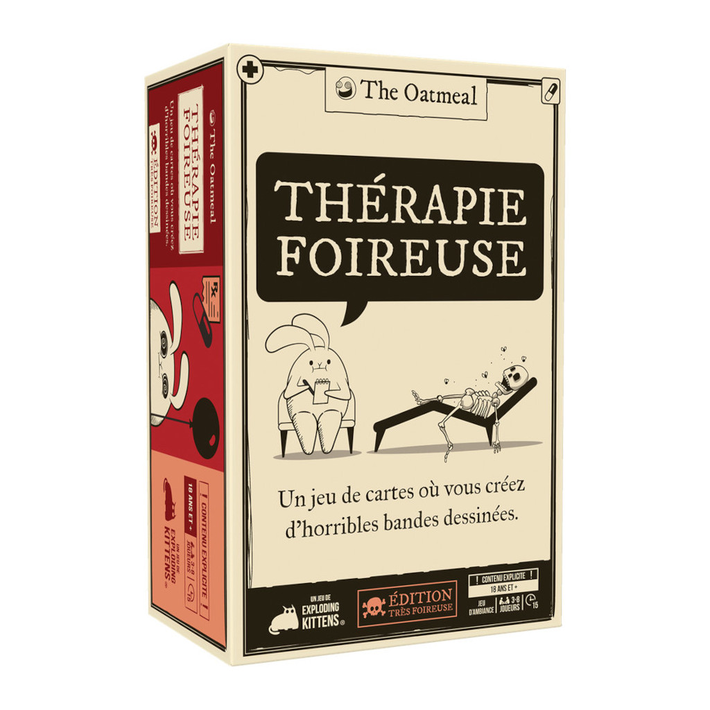Conçu par The Oatmeal (le célèbre auteur de BD) et les créateurs d’Exploding Kittens, Thérapie Foireuse est un jeu à l’humour noir délibérément trash, réservé aux adultes. Avec plus de 400 cartes, chaque partie est unique. Âmes sensibles s'abstenir ! Les autres s'amuseront...comme des petits fous !