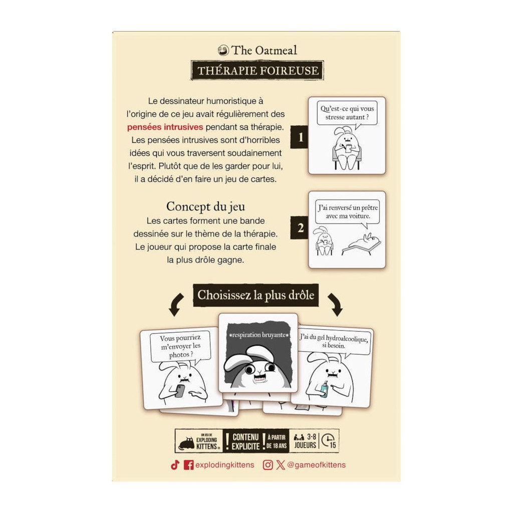 Conçu par The Oatmeal (le célèbre auteur de BD) et les créateurs d’Exploding Kittens, Thérapie Foireuse est un jeu à l’humour noir délibérément trash, réservé aux adultes. Avec plus de 400 cartes, chaque partie est unique. Âmes sensibles s'abstenir ! Les autres s'amuseront...comme des petits fous !