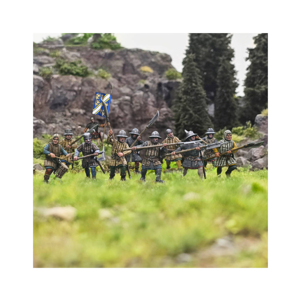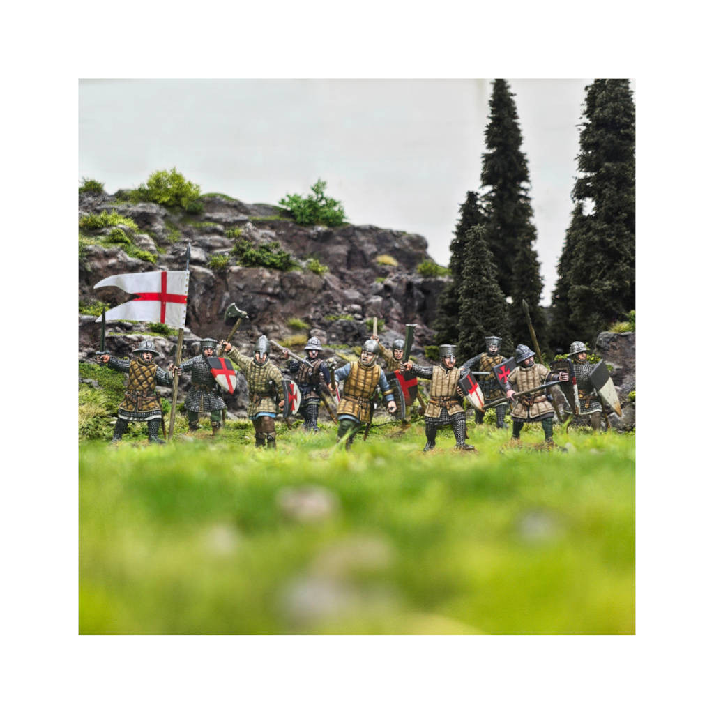 Ce set de 32 figurines représente des sergents médiévaux à pied de la fin du XIIe siècle à la fin du XIIIe siècle. Il comprend des poses impressionnantes et une grande variété d'armes, de têtes et de costumes.