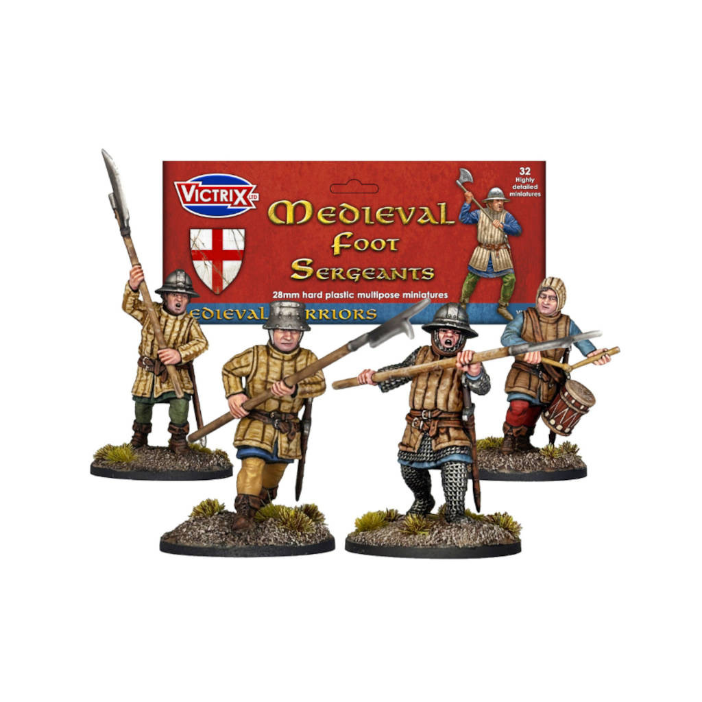 Ce kit plastique de la marque Victrix Miniatures vous permettra d'assembler 32 figurines de sergents médiévaux à pied avec plusieurs options d'équipements.