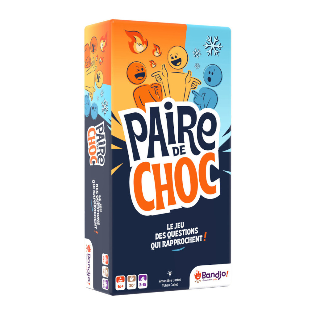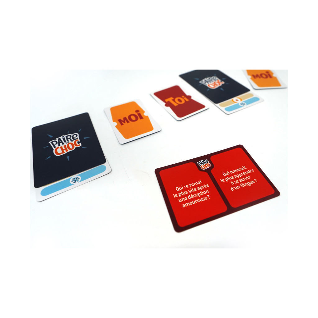 Paire de choc est le détonateur de soirée par excellence ! La boîte contient 300 questions décalées (Qui procrastine le plus ? Qui attire le plus les moustiques ? Qui a le prénom le plus sexy ? etc. ). Pour répondre, les joueurs vont simplement se comparer à leurs voisins de table et poser des cartes TOI ou MOI.Ambiance immédiate et surprises garanties lors des révélations !