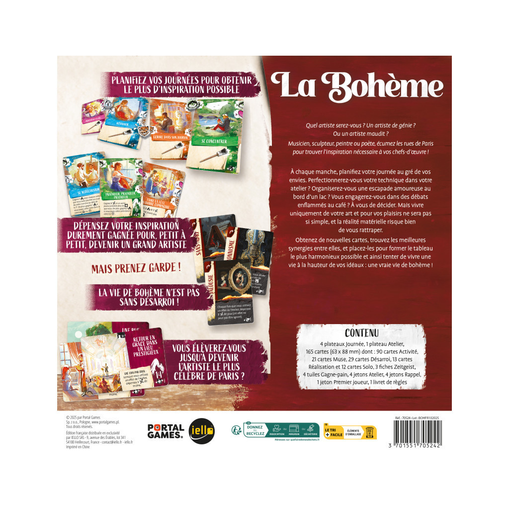 Dans La Bohème, les joueurs incarnent des artistes errant dans les rues de Paris au tournant des XIXe et XXe siècles, s’efforçant de créer des chefs-d’œuvre tout en relevant les défis du quotidien. La Bohème est un jeu de cartes de type deckbuilding, où les joueurs jouent leurs cartes pour trouver l’inspiration, chercher des muses et gérer les tâches du quotidien.