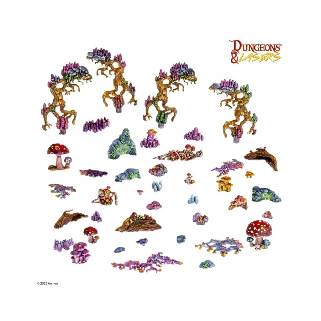 Cave Fungi, de la gamme Dungeons & Lasers contient 82 accessoires scéniques détaillés pour habiller votre décor de souterrain.