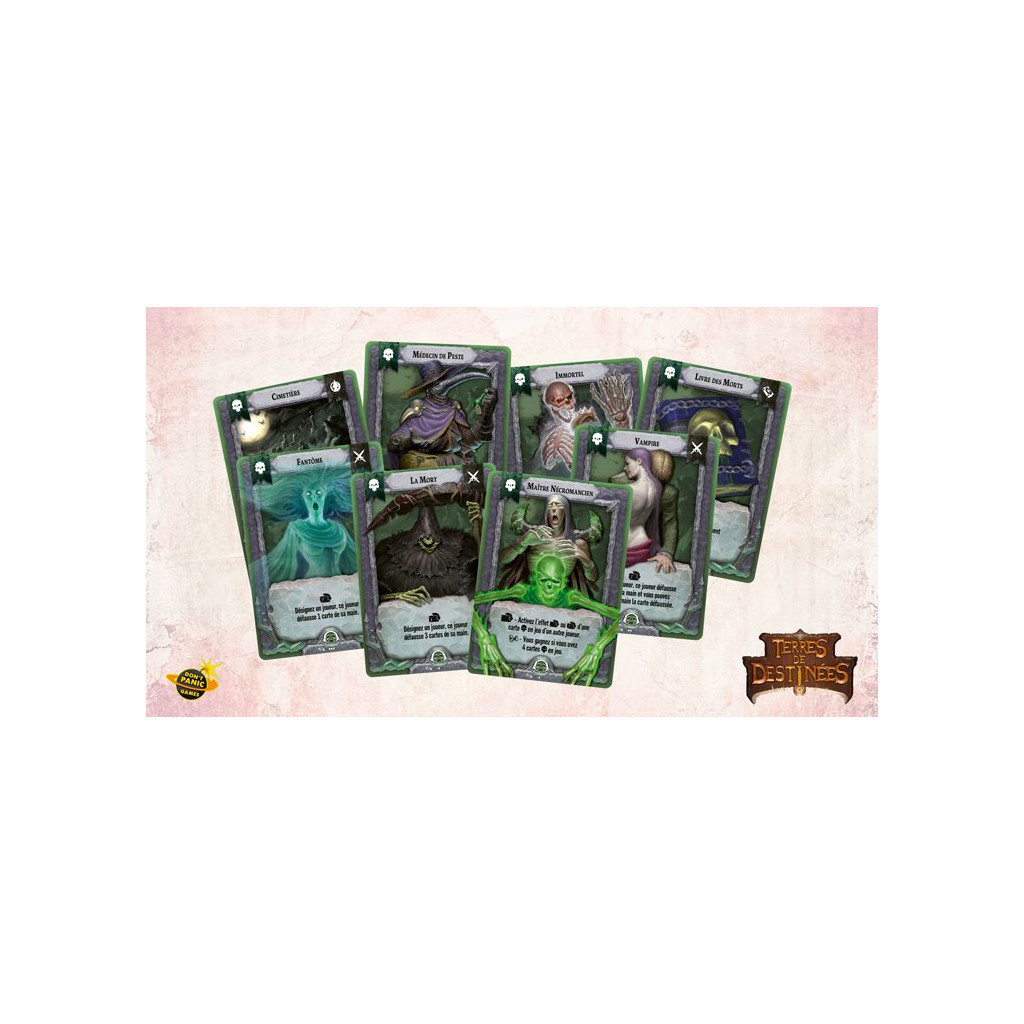 Chaque carte est liée à une famille (Nécromancie, Magie, Royaume ou Commerce) et possède parfois un type (Combattant, Terrain, Livre) influençant la partie. Le but : accomplir un objectif secret ou commun avant les autres… sans être éliminé !