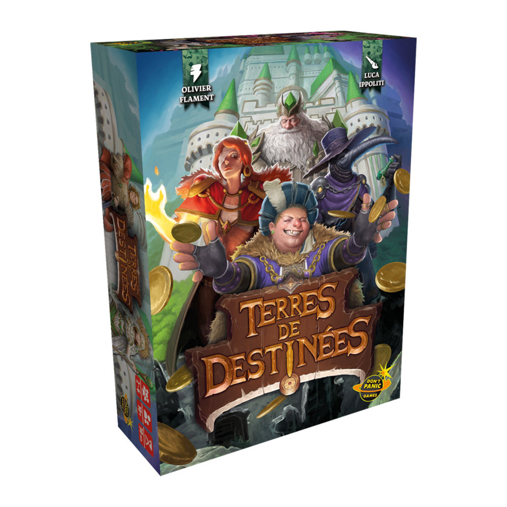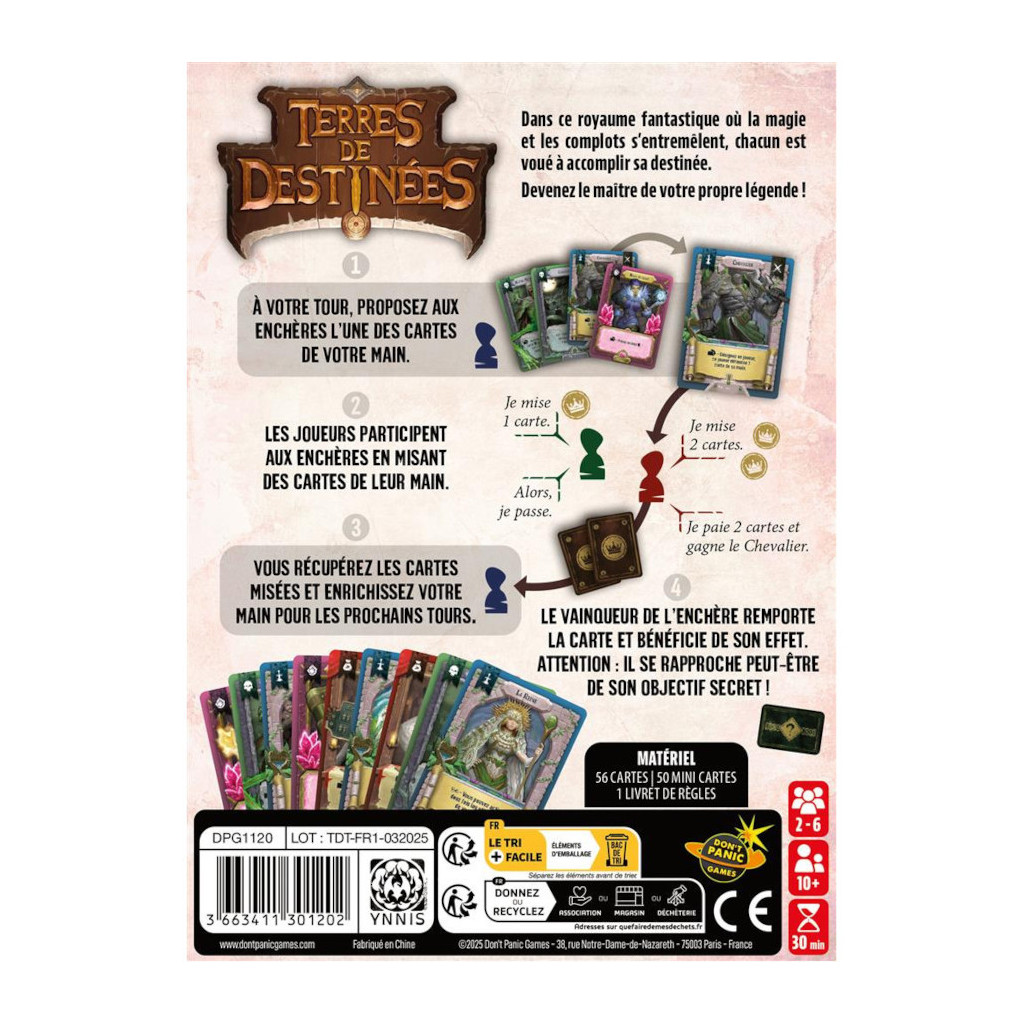 Dans Terres de Destinées, chaque joueur incarne un héros ou une héroïne prêt à marquer l’histoire d’un royaume rongé par la magie et les complots. Pour accomplir votre destinée, vous devrez remporter des enchères, déclencher des effets puissants et bluffer vos adversaires au bon moment.