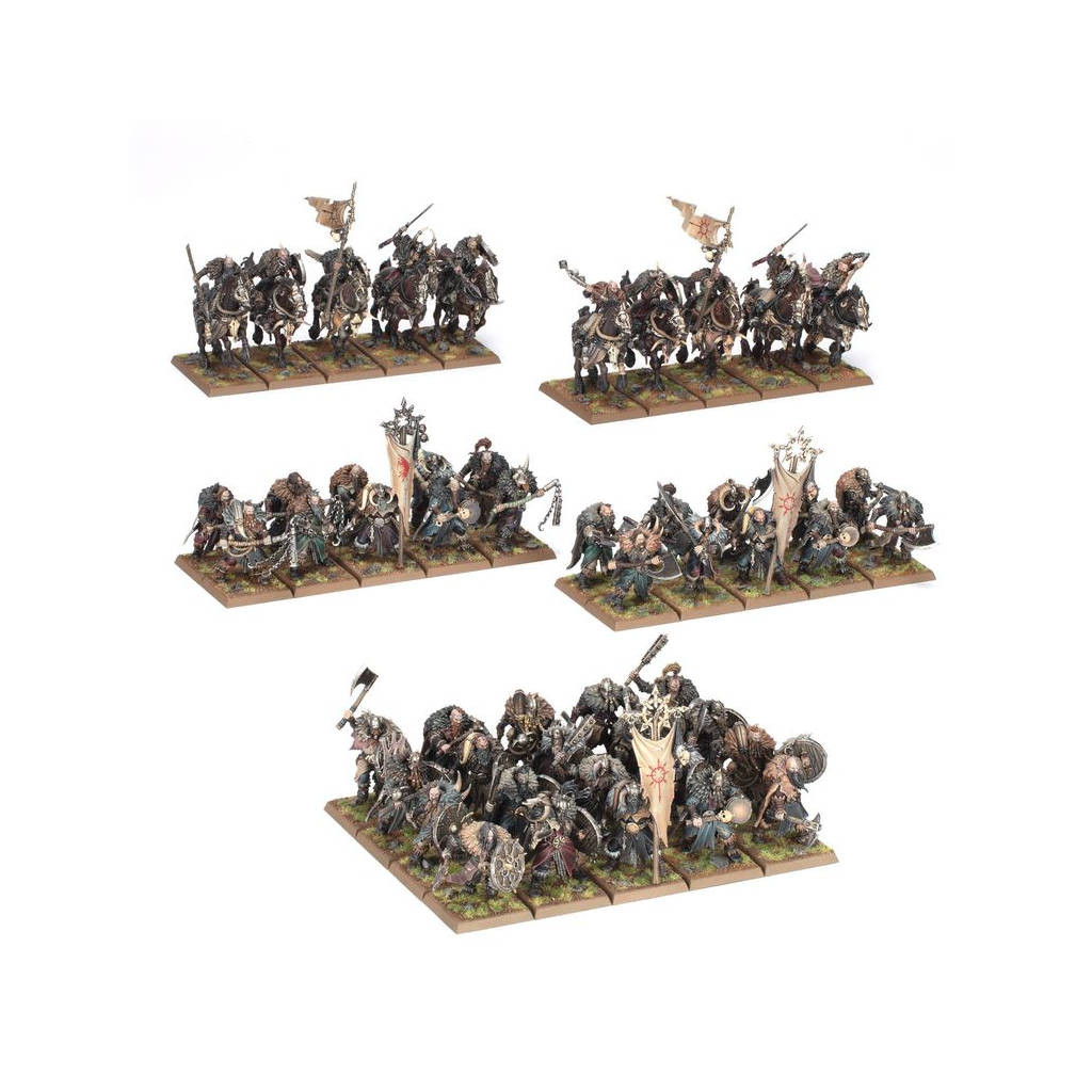 Les tribus qui résident sur les toundras au nord du Monde de Légende forment un peuple robuste dont la culture guerrière s'est établie au fil de longs siècles. Les Puissances de la Ruine sont venues dominer l'existence des tribus de Maraudeurs, car les esprits primordiaux que ceux-ci vénèrent correspondent en vérité aux divinités démoniaques de l'éther, se nourrissant de la dévotion qui leur est adressée par leurs servants mortels.Cette boîte bien remplie est idéale pour débuter une nouvelle collection de Guerriers du Chaos, ou pour étoffer une armée existante, à lâcher contre l'adversaire dans les parties de Warhammer: The Old World. Les Cavaliers Maraudeurs mènent la charge, en tirant parti de leur vitesse pour prendre de flanc et harceler les unités ennemies. Ils sont suivis par les Maraudeurs du Chaos, des combattants frénétiques venus des désolations froides du Nord. C'est dans cette boîte que vous aurez la première occasion de mettre la main sur les nouvelles figurines de Cavaliers Maraudeurs et de Maraudeurs du Chaos, et elle n'est disponible que dans la limite des stocks.Cette boîte permet d'assembler 50 figurines en plastique pour les Guerriers du Chaos :– 40x Maraudeurs du Chaos– 10x Cavaliers MaraudeursLes figurines de ce kit sont faciles à personnaliser. Les Maraudeurs du Chaos peuvent être assemblés en deux grandes unités de 20, ou quatre unités de 10, chacune avec ses propres champions, porte-étendards et musiciens optionnels. Chaque Maraudeur peut être équipé soit d'une arme de base et d'un bouclier, soit d'une arme lourde, soit d'un fléau. Les armes de base et les boucliers sont interchangeables entre toutes les figurines, et chacune d'elles dispose d'un choix de deux têtes, casquée ou nue.Les Cavaliers Maraudeurs peuvent être assemblés en une seule grande unité de 10, ou deux unités de 5, chacune avec ses propres champions, porte-étendards et musiciens optionnels. Chaque Maraudeur peut être équipé soit d'une lance et d'un bouclier, soit d'un fléau, et chacun d'eux dispose d'un choix de deux têtes, casquée ou nue.Ce kit est fourni avec 2x Planches de Décalcos des Guerriers du Chaos, proposant chacune 246x décalcos de grande qualité. Elles incluent des marquages pour le Culte du Chien Sanglant, le Culte du Serpent Sinueux, le Culte de la Corneille Noire et le Culte du Rapace Néfaste, ainsi que d'autres symboles et runes maudites du Chaos.Ce kit est composé de 664 éléments en plastique, de 10x Socles Rectangulaires Citadel de 60x30mm et de 40x Socles Carrés Citadel de 30mm