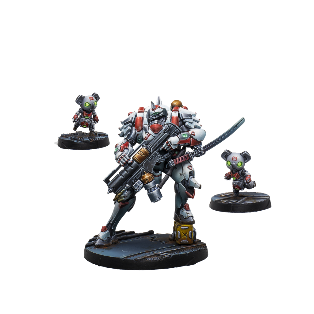La boîte JSA O-Yoroi Kidobutai Tag Pack contient 1 armure lourde (et ses deux crazykoalas) pour renforcer la faction JSA à Infinity.
