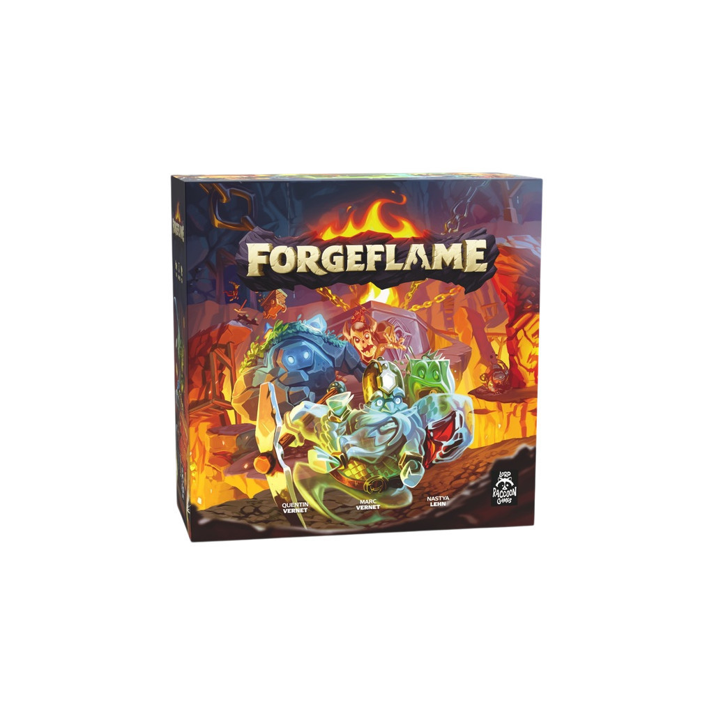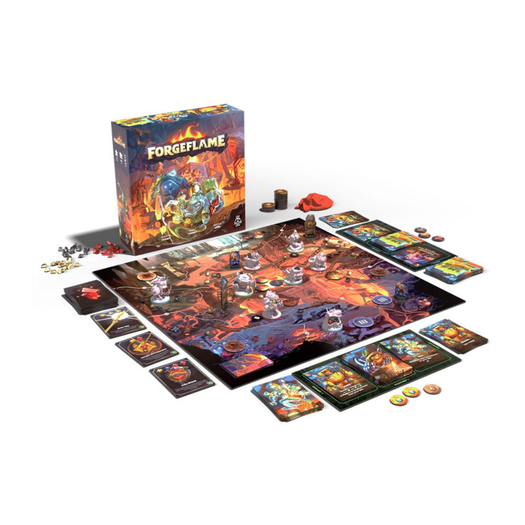 Dans Forgeflame, vous incarnez une équipe d’aventuriers lancés dans l’exploration d’une ancienne mine naine. Votre objectif : collecter des minerais rares, affronter les dangers qui rôdent sous terre, et forger des artefacts légendaires avant vos adversaires. Chaque partie est alors une course où vous devrez optimiser vos déplacements, améliorer progressivement votre deck d’actions et gérer au mieux votre équipe pour accumuler des points de victoire. La partie prendra fin lorsqu'un d'entre vous forgera quatre artefacts ou si les Kobolds envahissent la mine, mais seul celui qui aura cumulé le plus de points remportera la partie.