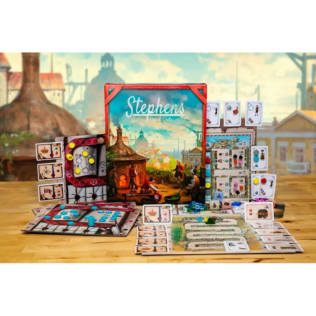 Dans Stephens, les joueurs s'affrontent en tant que maîtres verriers travaillant dans la désormais célèbre usine Stephens pour devenir la figure la plus prestigieuse de la ville... après Stephens, bien sûr. Grâce à une planification astucieuse et ingénieuse, tous les joueurs développeront leurs œuvres, investiront dans de nouvelles entreprises et favoriseront la création d'emplois. À travers un mécanisme unique de sélection d'actions, les joueurs choisissent à leur tour parmi une variété d'options, soit en activant l'usine Stephens, soit en activant l'un de leurs investissements personnels.