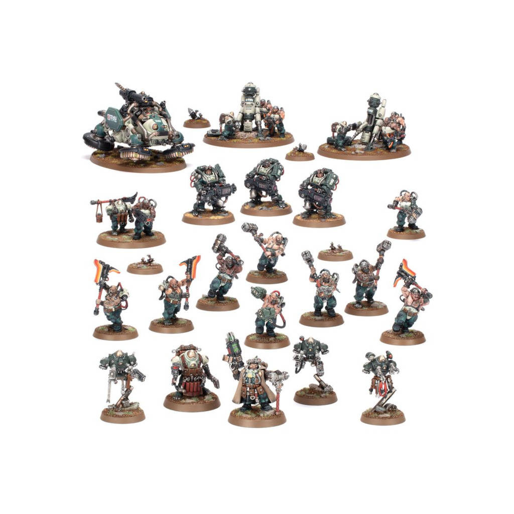 Cette boîte pleine à craquer est parfaite pour entamer une nouvelle collection des Ligues de Votann ou pour étoffer une armée existante que vous pourrez ensuite déchaîner dans les parties de Warhammer 40,000, en faisant des économies par rapport à un achat des kits au détail. Mené par un astucieux Maître-fer Brôkhyr et son escorte, le gros de cette force est constitué de Beserks Cthoniens agressifs prêts à en venir aux mains avec l'ennemi. Ils sont soutenus par les armes lourdes des Tonnekogs Brôkhyr, ainsi que par deux puissants Trembleterres Cthoniens. Un Défenseur Kapricus offre un soutien réactif et peut autrement être assemblé comme Porteur Kapricus pour amener vos troupes là où vous en avez besoin.